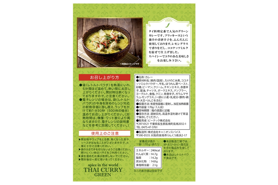 本場タイの本格グリーンカレーを再現した味わいと、感謝の気持ちを伝えるユニークなメッセージの調和が特徴です。