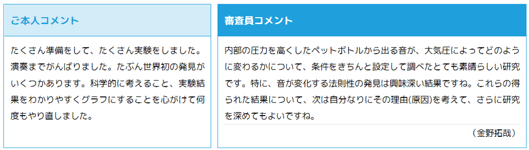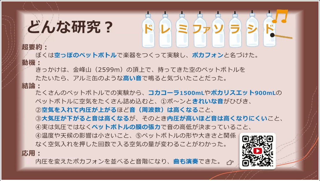 小学生の部・最優秀賞は小学4年生・疋田濯さんによる「ペットボトル内の気圧を調整して作る楽器“ポカフォン”の研究」