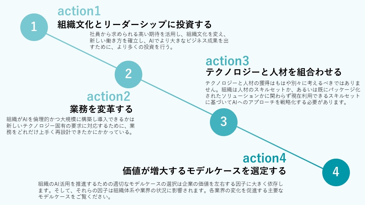 この順番について、注目してみましょう。時代の変化に備えるには、何か専用のシステムや機械・AI人材を獲得することが先に来るのではなく、まずは自社の文化醸成と組織を引っ張っていく人材を作ることが最初に必要だと結論づけています。つまり、AI時代の到来と同時に「人にしかできない仕事」の重要性が高まる時代が到来すると予想されます。企業が自社の付加価値を明確にし、リーダー層を育て、共通認識を持って進む組織になれるかどうかが、「AIに取って代わられる」かどうかの分かれ目といえるのではないでしょうか。