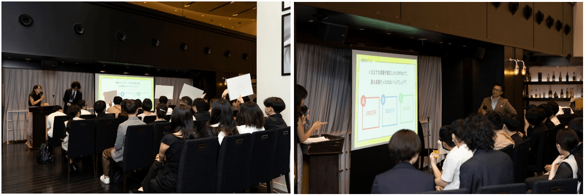 本イベントの会場は、ザ・クルーズクラブ東京。企業説明会に加えて、ブランド品の鑑定を体験できるクイズ企画や、お料理と楽しむディナークルーズ、東京湾の夜景をバックにプロのカメラマンによる記念写真撮影会といった様々な企画をご用意しました。コロナ禍で交流が難しかった就活生に対して、交流の場と豪華なツアーを提供し、素敵な時間と大黒屋の社風を体感していただきたいという思いから実施に至ったイベントです。大黒屋 代表取締役社長・小川浩平は、ディナークルーズを実施したねらいについて、「私たちの会社の役割は、場を提供することだと思っています。いまの学生はコロナ禍でずっと苦しいところがあったと思うので、そんな彼らに対して“世の中ってこんなに面白いんだよ”ということを伝えたいと考え、今回のイベントを開催しました。リクルーティングの目的ももちろんありますが、それよりも、日本の若い人たちにもっと色んな楽しみを知ってもらいたいというのが真の目的です」と語りました。