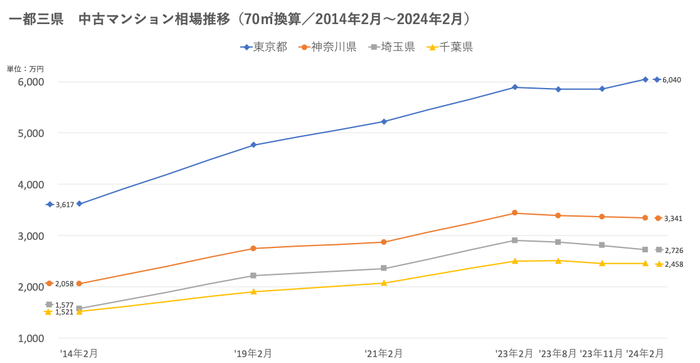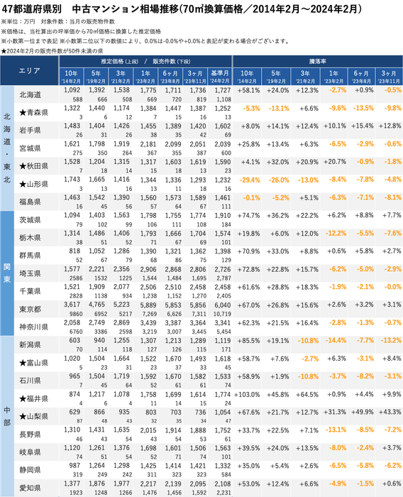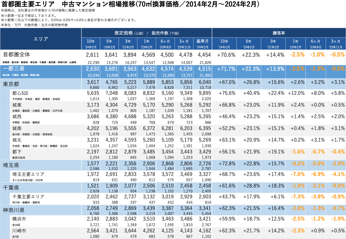 「不動産×WEB×ビッグデータ」の領域で、さまざまな不動産テックサービスを展開する株式会社ワンノブアカインド(本社:東京都港区、代表取締役社長:川島 直也、以下当社)は、当社が運営しているマンション情報サイト「マンションレビュー」の保有データを元に、全国の2024年2月の中古マンション相場を調査。坪単価をベースに70㎡での価格に換算した「中古マンション価格」*1について、10年前・5年前・3年前・前年からの推移を都道府県別・エリアごとにまとめましたので、発表いたします。