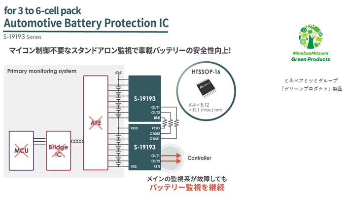 ミネベアミツミグループのエイブリック株式会社(社長:田中 誠司、本社:東京都港区、以下:ABLIC)は本日より、車載用3~6セルバッテリー監視IC「S-19193シリーズ」の販売を開始しました。