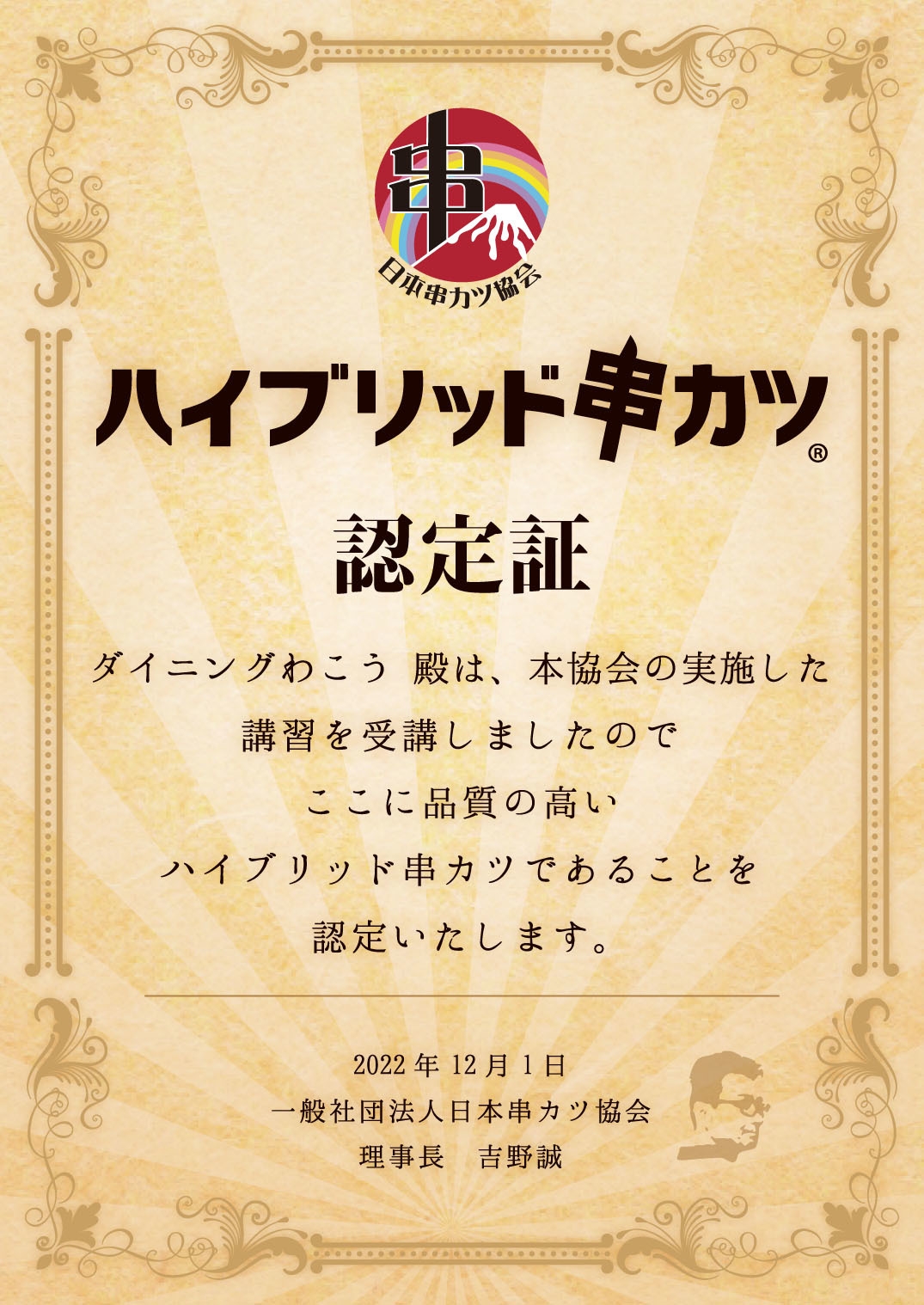 一般社団法人日本串カツ協会のよる東北初監修店として「ダイニングわこう」(和光興業株式会社運営)が12月にオープンします。