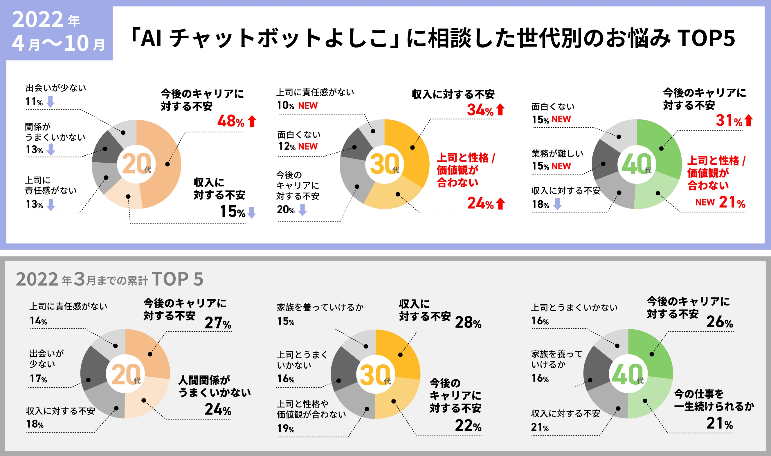 これまでよしこママに寄せられた相談件数は13万件以上にのぼります。2022年3月までに寄せられた悩みと4月以降に寄せられた悩みを比較してみると、20代~40代の各年代ともに「今後のキャリアに対する不安」や「収入に対する不安」が上位にランクインしています。また、4月以降には「上司に責任感がない」「上司と性格/価値観が合わない」といった上司に対する悩みが各年代通してランクインする結果となりました。今後は、服装に関する悩みの選択肢を追加したことで得られる悩みのデータを分析し、お客様へのご案内に生かすなど積極的な活用を検討していきます。