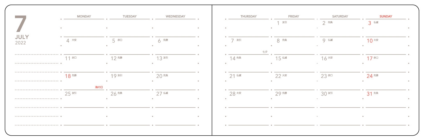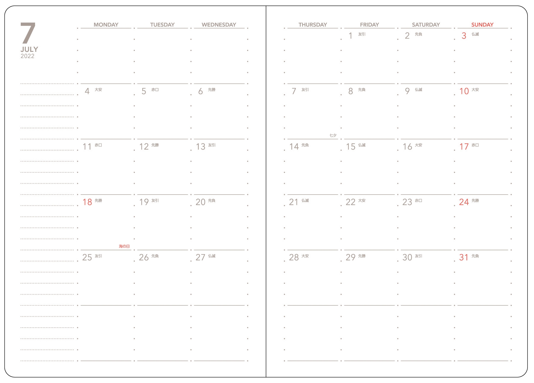 ページ数 :マンスリー A5 / B6サイズ:80ページ、A7メモサイズ:64ページ