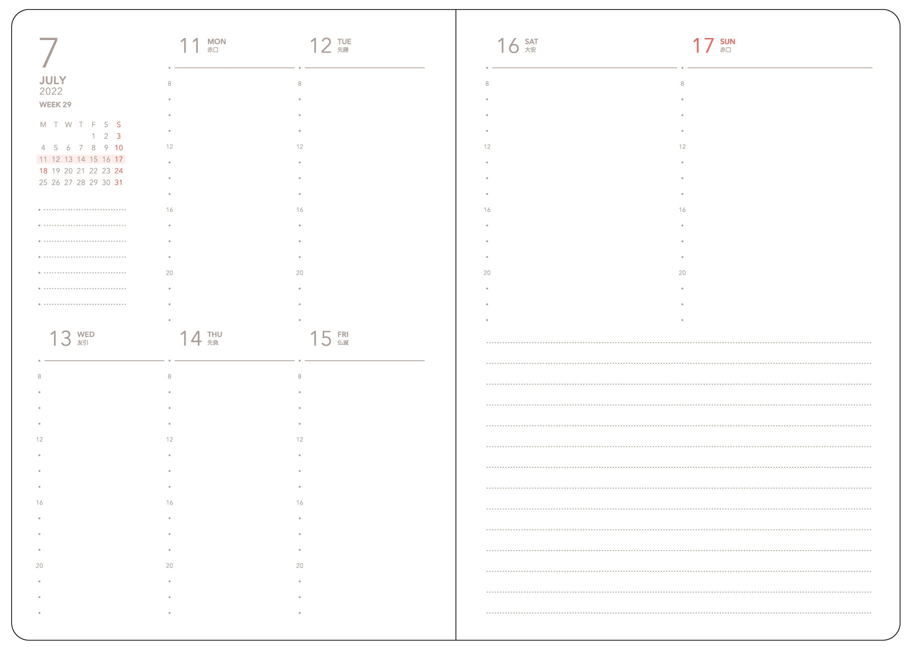 土日のスペースが充実した週間ブロックは「予定+α」の記録やライフログにも使いやすいレイアウト。8時~22時の目盛つき。