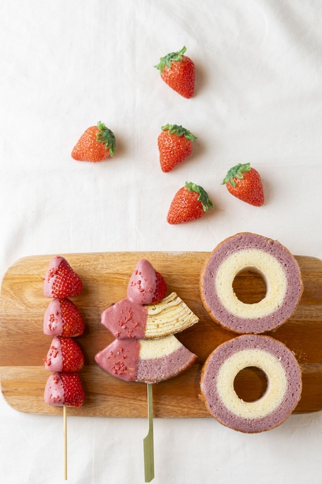 店内工房にて手作りで焼き上げている「いちごのバウムクーヘン」を使った、イベント期間限定の串メニューやソフトクリーム、そして限定デザインのノベルティをご用意いたしました。