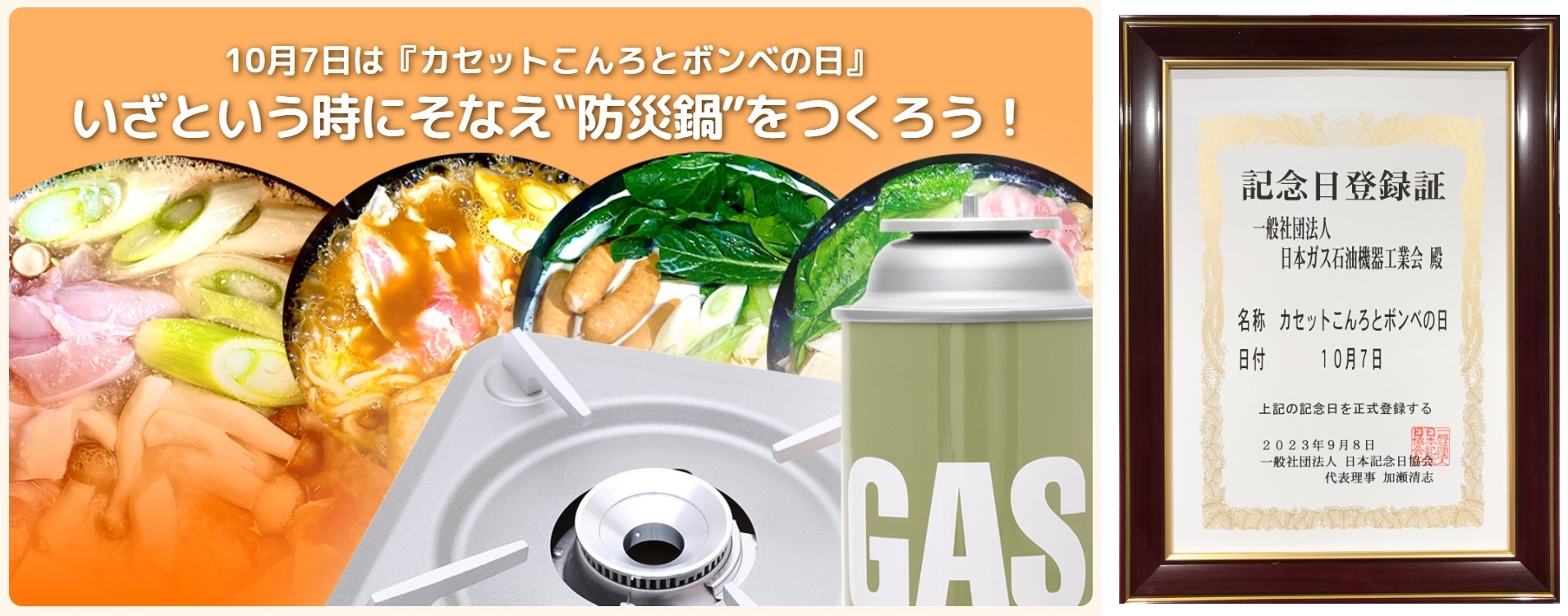 一般社団法人 日本ガス石油機器工業会(東京都千代田区、以下「日本ガス石油機器工業会」)は、カセットこんろの買い替え検討目安の10年、カセットボンベの使用期限の7年にあわせて10月7日を「カセットこんろとボンベの日」に制定し、一般社団法人 日本記念日協会に認定されました。