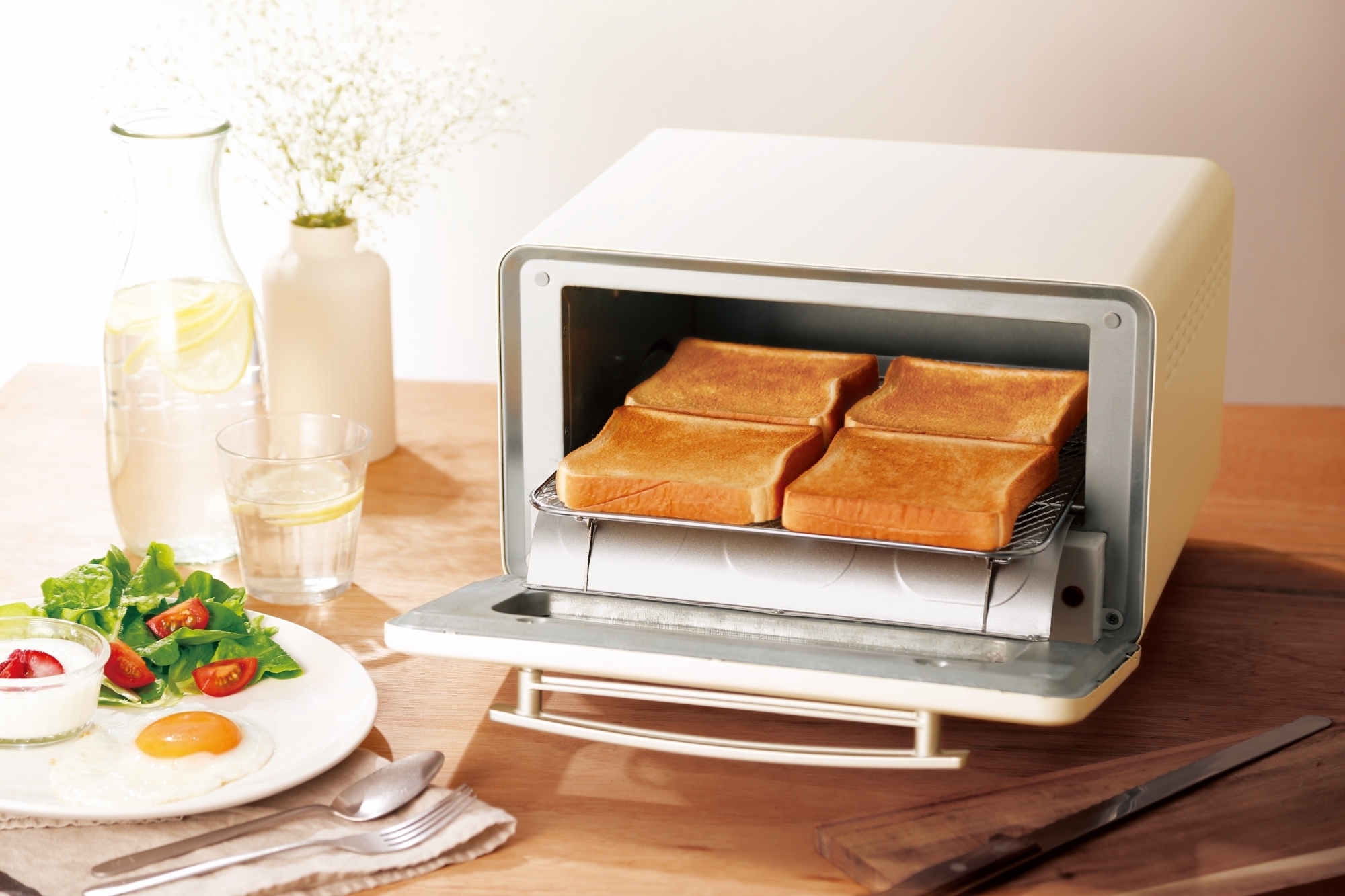 一度に4枚の角型食パンが焼けるので、忙しい朝にもおすすめ。受皿付きで直径20センチのピザもラクラク焼けます。