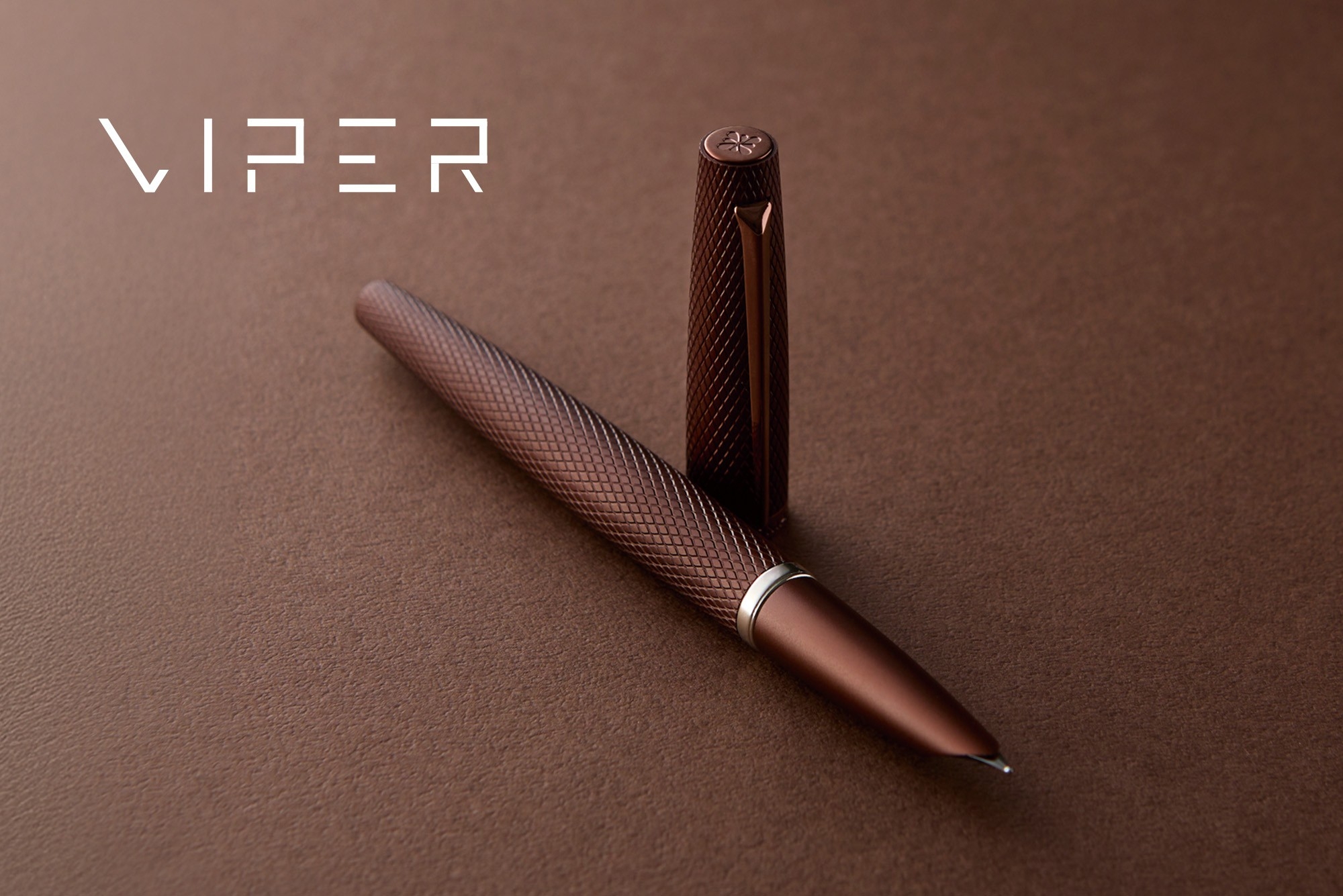 VIPER(バイパー)は、ギロシェパターンの彫刻だけでなく、アノダイズ加工のメタリックな風合いの仕上げとも好相性となっており、流線型のフォルムはボディ、グリップ、そして精緻に設計され滑らかな書き味を発揮するフーデッドニブへと一体感のある曲線を描きます。従来使用していた14金ペン先(エクセレンスA2、アエロなど)をステンレスにすることで価格を抑え、初めての万年筆としても最適なアイテム。機械で代えることの出来ない熟練による手作業で作り上げられたVIPERは、ブラウンの登場により、ブラウン/ブルー/ブラックの3色から自分のスタイルに合わせて選択できるようになります。