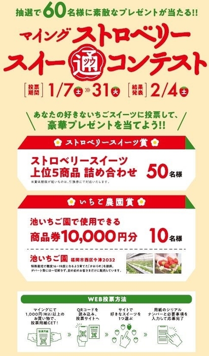 マイング各店舗選りすぐりの博多あまおうをはじめとした「いちご」を使ったスイーツ、27エントリー商品の中から、お客様による投票で人気No.1が決まります。さらに、投票していただいた方の中から抽選で、50名様にコンテスト上位5位のスイーツ詰め合わせ、または10組様にいちご農園で使える商品券10,000円分をプレゼントいたします。