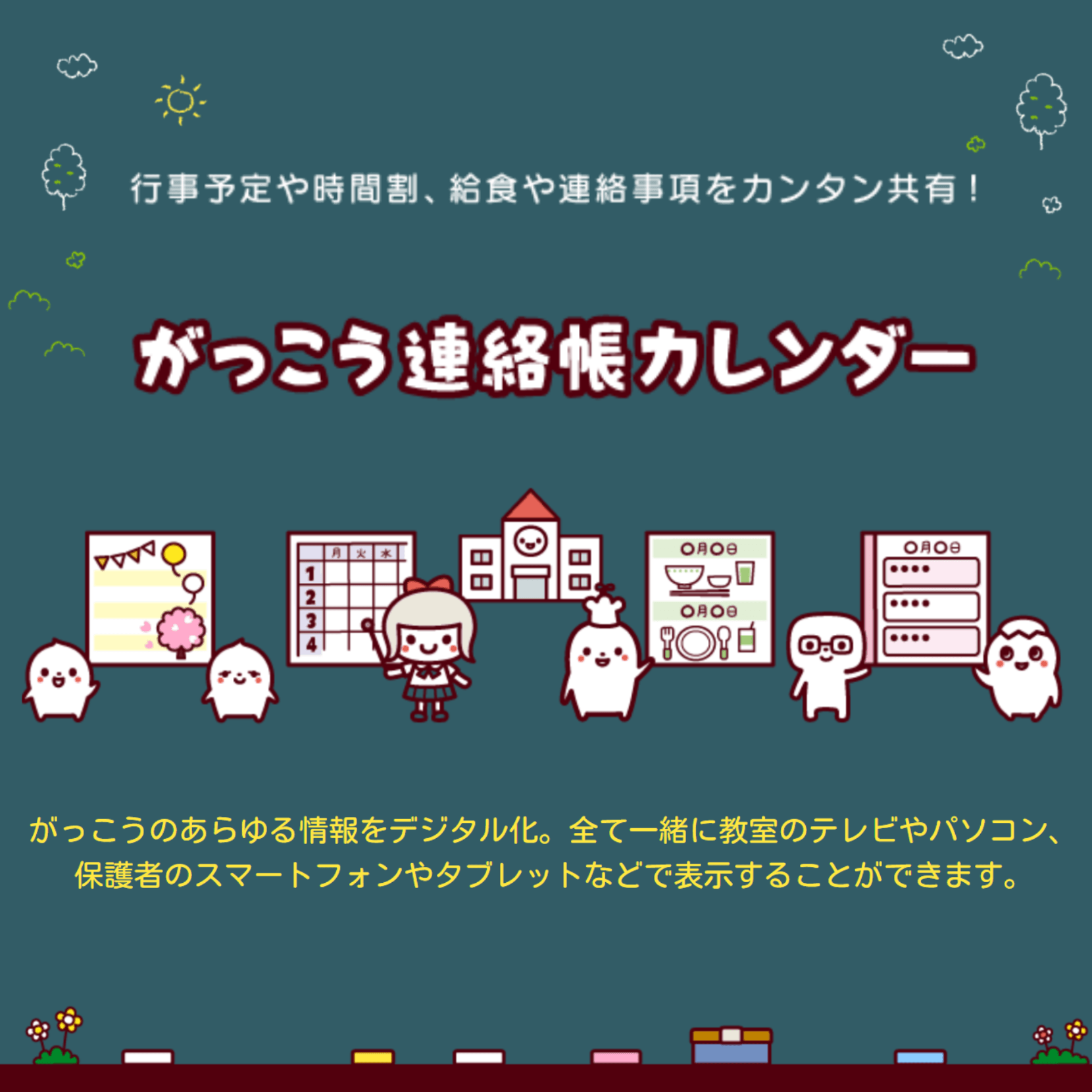 「がっこう連絡帳カレンダー」と同様に、WEBで表示予定表を簡単に作成できるサービス。これまで紙で配っていた行事予定表を、分かりやすい表形式で誰でも簡単に作成することができます。作成した行事予定表は、スマートフォンのWEBブラウザで表示することができ、印刷やエクセル形式のファイル出力、各学校等のホームページへの組み込み(行事予定データは自動で更新されます)などが簡単に実現できます。