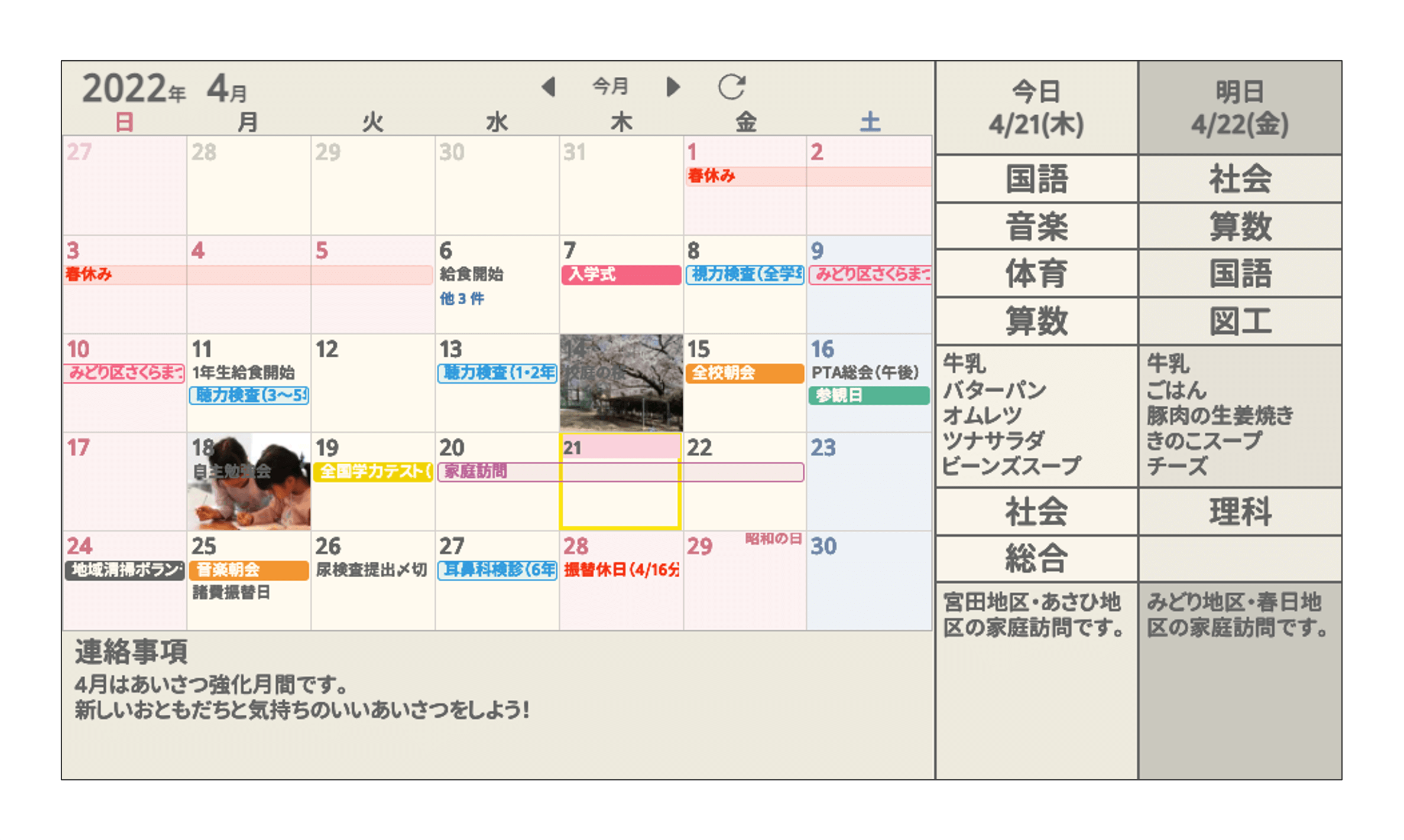 このサービスはソニーマーケティング株式会社が提供する法人向けブラビアを活用し、教室に設置した大型提示装置に、行事予定や時間割、給食の献立、連絡事項の情報をまとめて表示するサービスです。また、保護者のスマートフォンでも同じ情報を閲覧でき、いつでも手軽に最新の情報を確認することができます。保護者への配信は難しいアカウント管理などはなく、QRコードだけで共有が可能であるため、告知の手間も大幅に省くことができます。