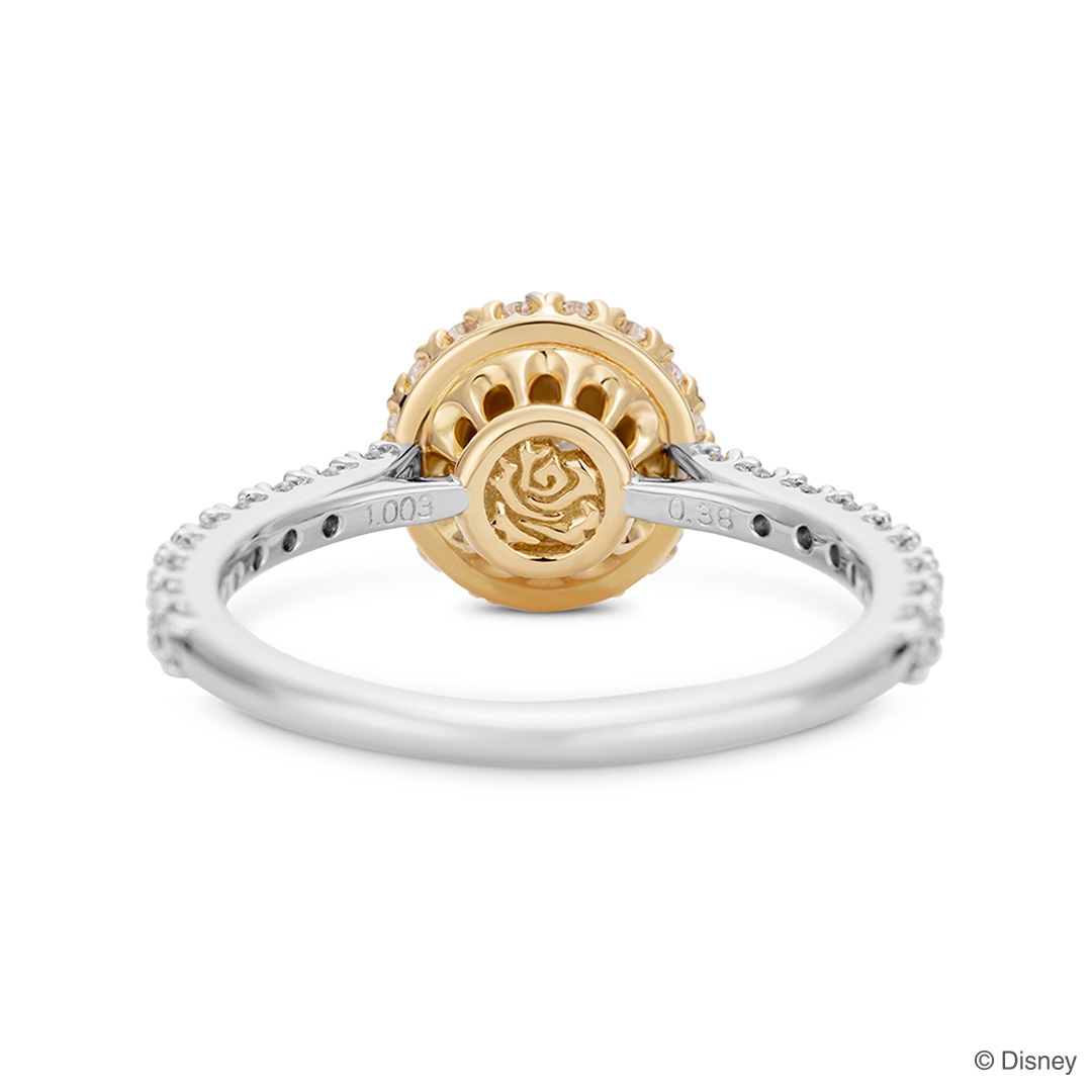 1.0ct台のシンプルながら華やかなラウンドカットダイヤモンドがセンターに輝くデザインです。大粒のダイヤモンドを支える石座は、「ベル」と「野獣」が心通じ合い踊るボールルームの装飾をイメージ。34ピースのメレダイヤモンドがきらめきを添えます。石座の裏側に、真実の愛へと導いた「魔法のバラ」のモチーフをデザインしています。
