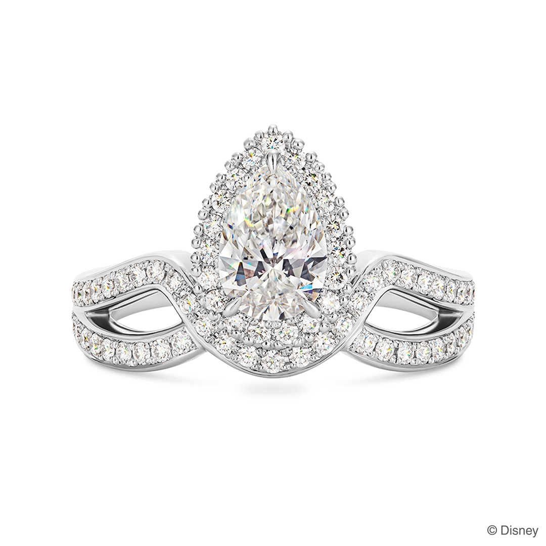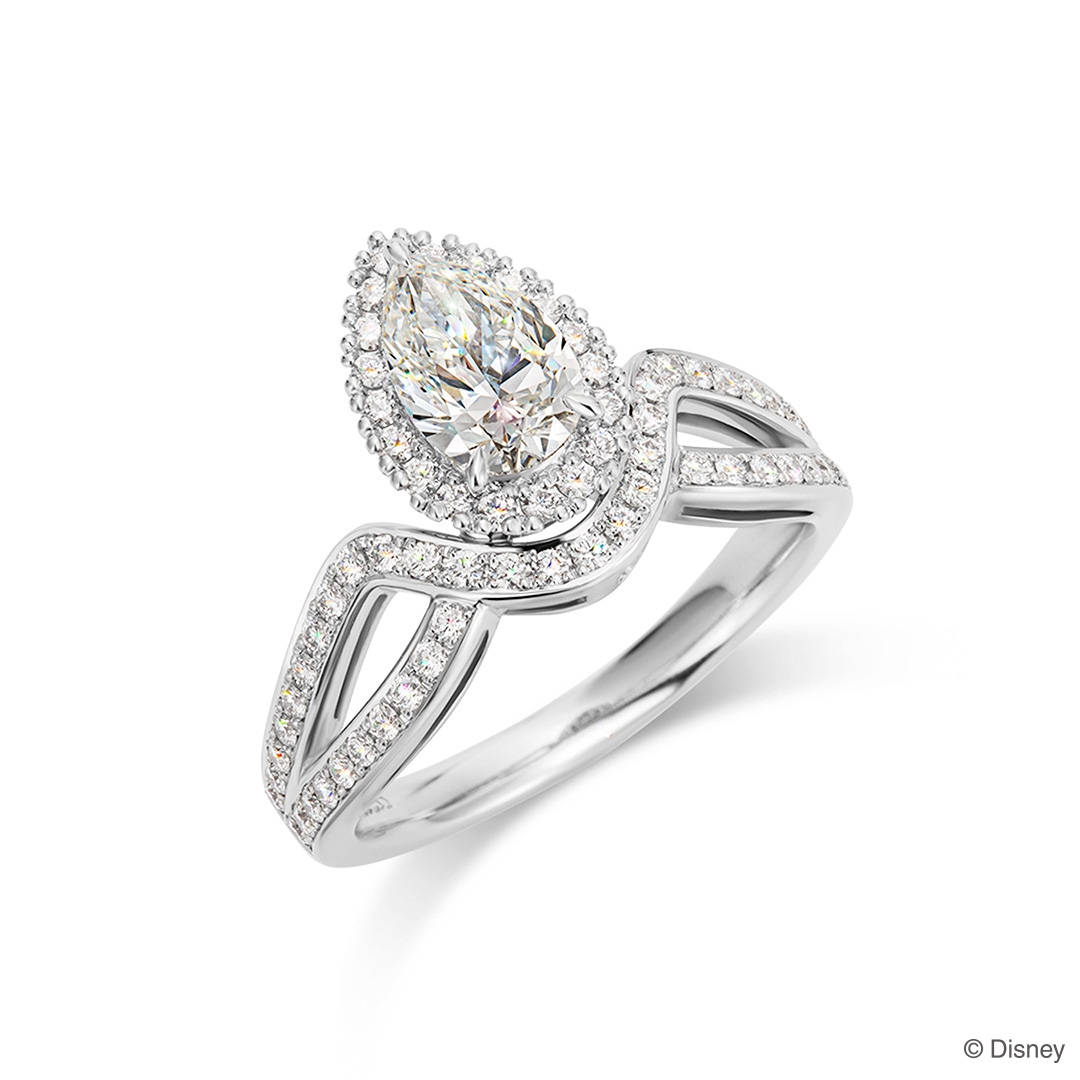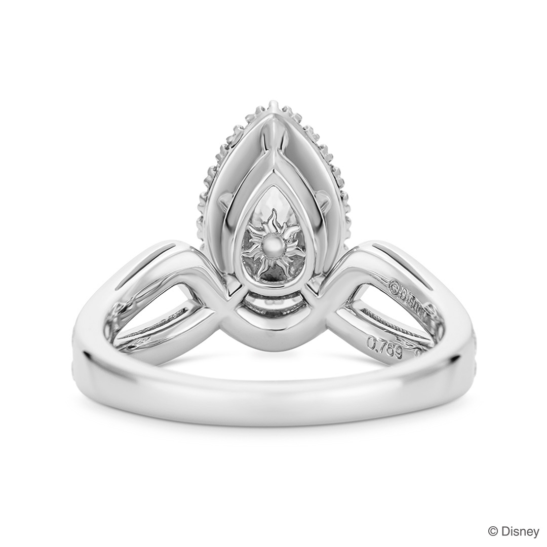 『塔の上のラプンツェル』に登場する「ラプンツェル」のティアラにインスパイアされたデザイン。ひときわきらめくペアシェイプカットダイヤモンドの周りにメレダイヤモンドをセッティングし、さらに華やかさを添えます。裏側には王国のシンボル「太陽の紋章」をデザインしました。