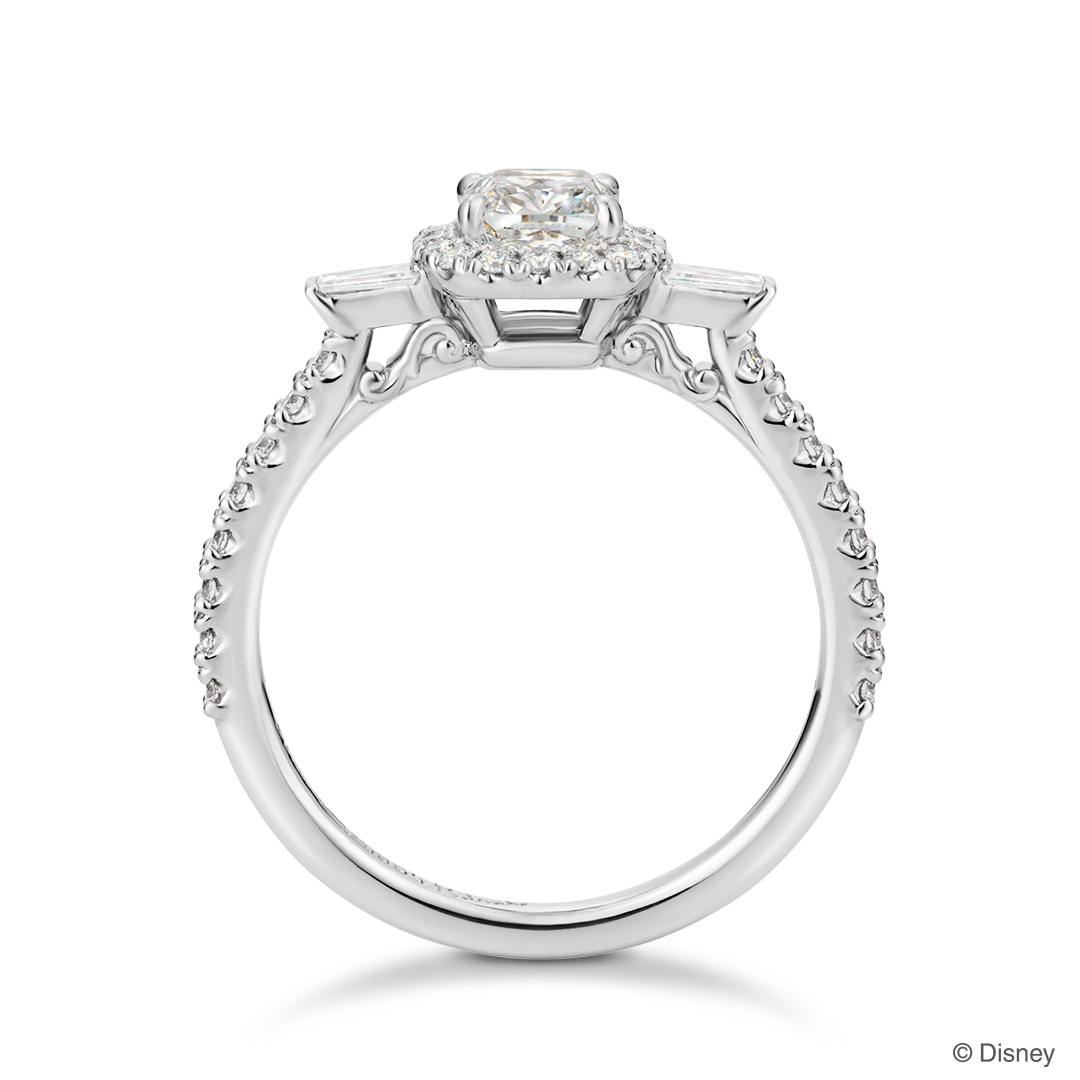 「シンデレラ」をイメージしたクッションカットダイヤモンドをセンターに。石座の隣にはテーパーカットのダイヤモンドを留めました。32ピースのメレダイヤモンドが、魔法のように華やかなきらめきを放ちます。側面には「お城」の装飾をモチーフにしたデザインを施しました。石座の裏側には、「シンデレラ」の夢を叶えるきっかけとなった「ガラスの靴」のモチーフを添えています。