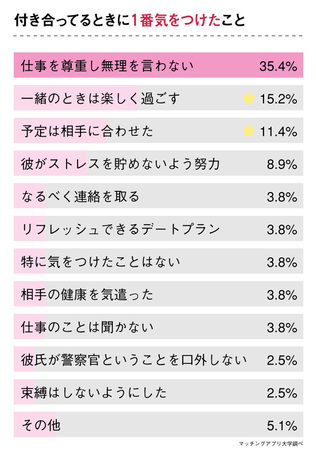 付き合う前に気をつけたことは「警察官という仕事を尊重し、無理を言わないようにした」が34.2%でダントツ1位でした。2位は「時間や日程だけは相手にできるだけ合わせるように心がけた(22.8%)」でした。