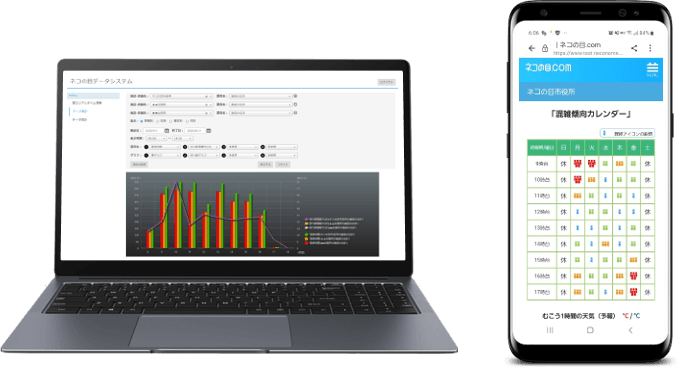 また、担当職員向けの機能として、毎日の紙出力とエクセル入力で管理していた1日の来庁者数などの窓口発券機のデータ集計を「ネコの目データシステム」でWeb管理することで、集計の手間を大幅に軽減。待ち人数や待ち時間といった混雑対策に不可欠なデータを簡単に可視化できるほか、過去のデータから混雑傾向カレンダーを自動生成し「ネコの目.com」に表示する機能など、担当職員の負荷軽減と区民サービスの向上に寄与するデータ活用サービスを提供します。