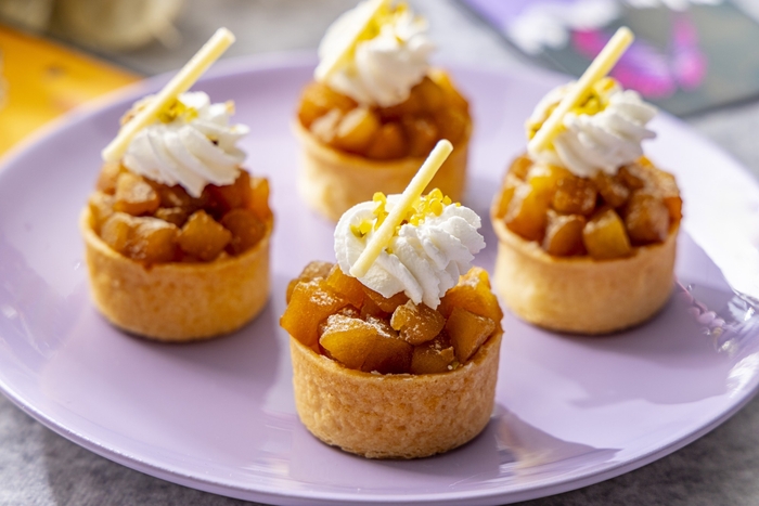 約15種類のセイボリーには、ビーツの鮮やかな色合いが美しい「漆黒のドリア~イカ墨とビーツ~」、星や月型のチップスを飾った「魔女のシーザーサラダ」、魔女がコトコト煮込んだ濃厚な「紫芋のポタージュ」など、宮殿のパーティーに華を添えるメニューが登場。その他、りんごジャムで甘みとまろやかさを加えた「りんごジャムの照り焼きチキン」や「キノコのマリネとピンクのビーツバターのオープンサンド」、「かぼちゃのキッシュ ハーブの香りのナッツデュクセル添え」など秋らしいラインナップもお楽しみいただけます。