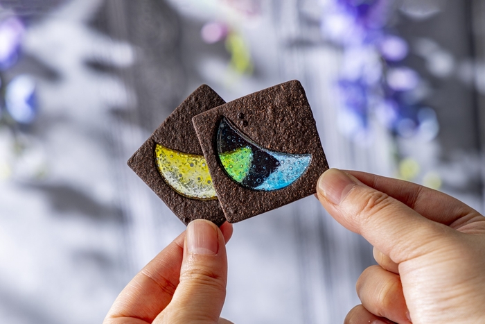 ココアクッキーに飴を流したパリッとした食感が楽しいステンドグラスクッキーは、黄色と水色の2色をご用意。2色を重ねると色が変わるマジカルクッキーです。