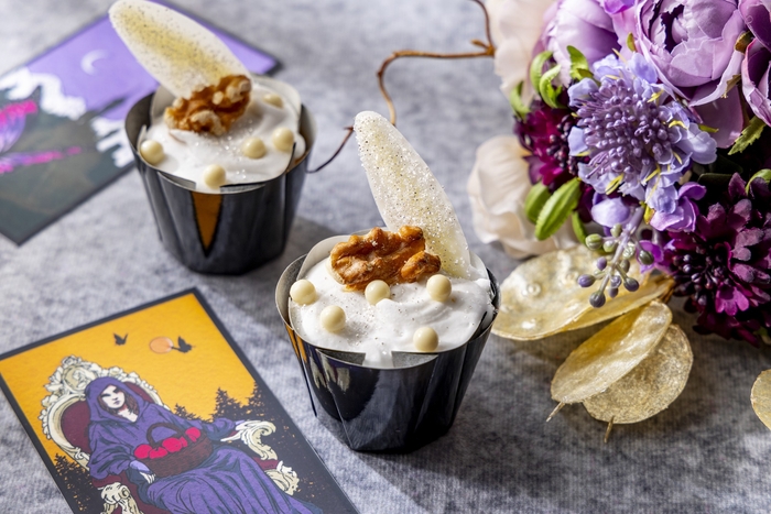 クルミとかぼちゃペーストを入れて焼き上げた秋の味覚を楽しむカップケーキ。トップにシュガー、パールクラッカン、羽根を模したホワイトチョコなどを飾り、神秘的な占いカードを彷彿とさせるデザインにしました。