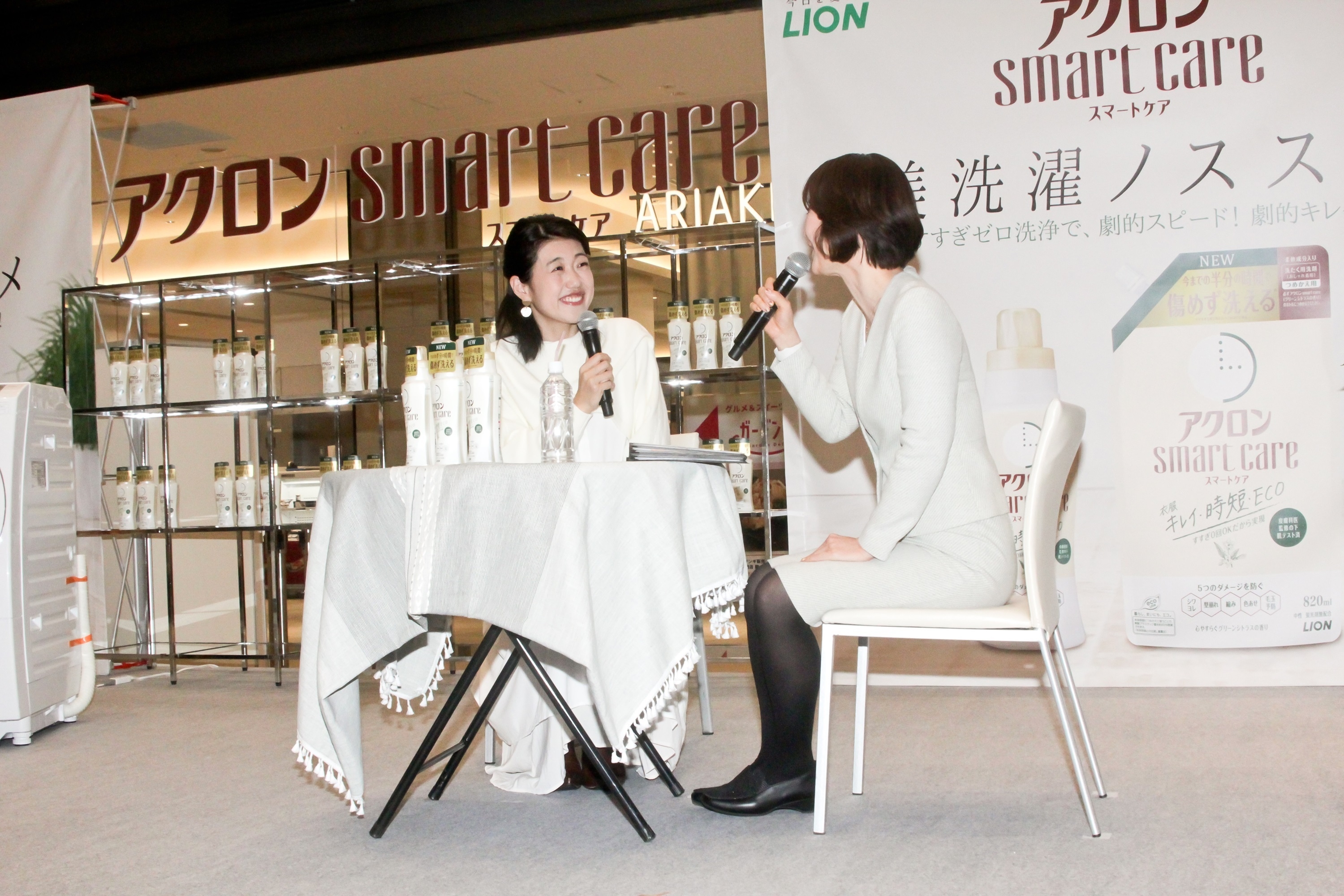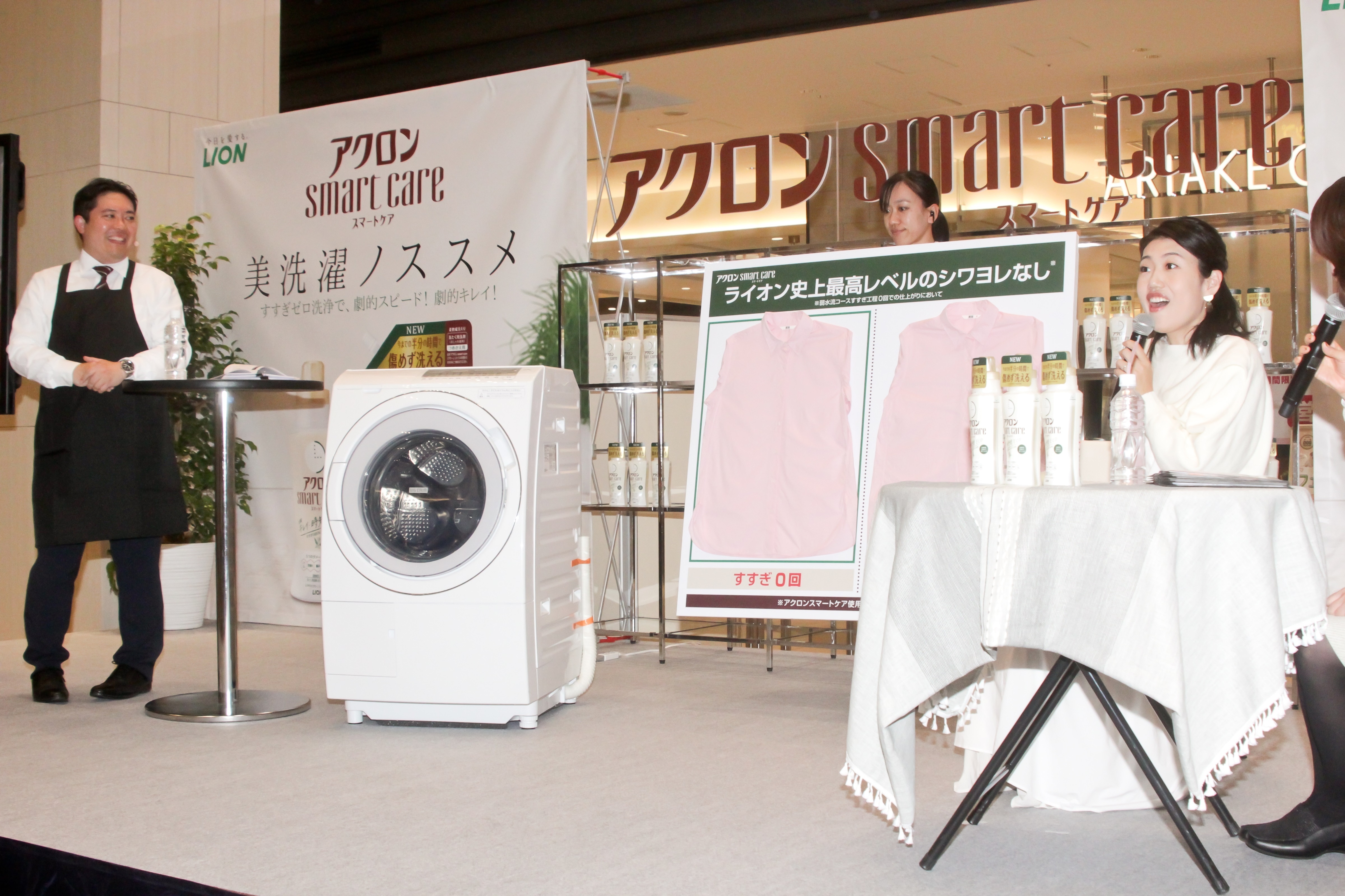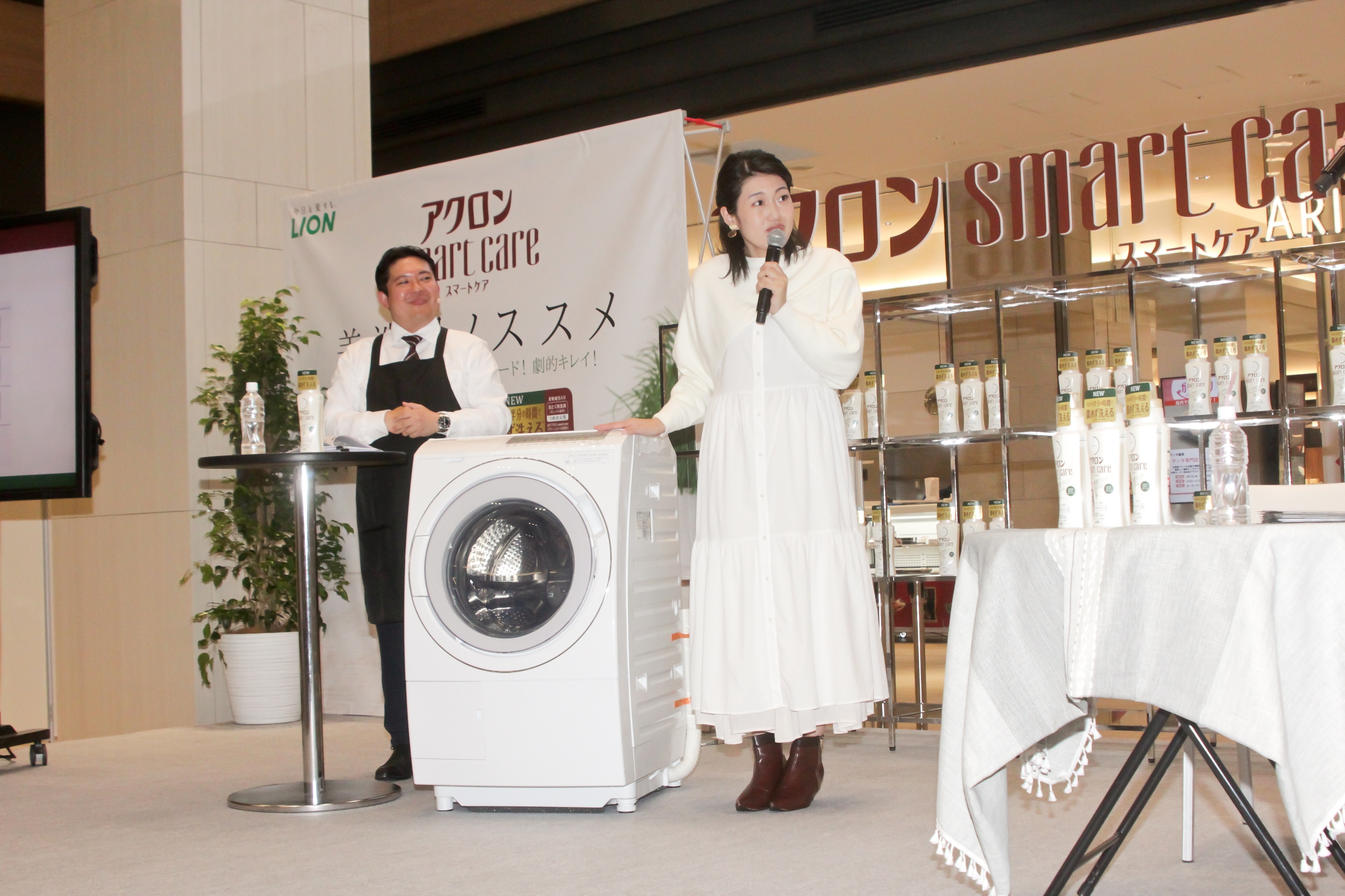 イベントには、お笑いタレントの横澤夏子さんが登壇。「美洗濯ノススメ」をテーマに、軽快なトークを繰り広げました。タレントとしてだけでなく、3児の母として、日々大忙しの横澤夏子さんが、洗濯にちなんだ洗い流したい過去や横澤流家事時短術に加え、バレンタインのエピソードなどについて語りました。イベントの後半には、実演販売士である中谷健太郎さんが、すすぎゼロを実現するおしゃれ着用洗剤『アクロンスマートケア』を使った「美洗濯」のコツや洗濯機の設定について解説。『アクロンスマートケア』を使えば洗濯時間が短縮できるということで、横澤さんは食い入るように話を聞いていました。