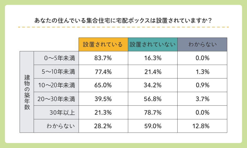 宅配ボックスが設置してある集合住宅の築年数を調査したところ築0年~5年未満の新築集合住宅では設置率83.7%という調査結果が得られました。一方、築20年~30年未満では39.5%、30年以上の集合住宅では21.3%の設置率となっており、築年数が古くなるにつれて宅配ボックスの設置率が低くなるということがいえそうです。