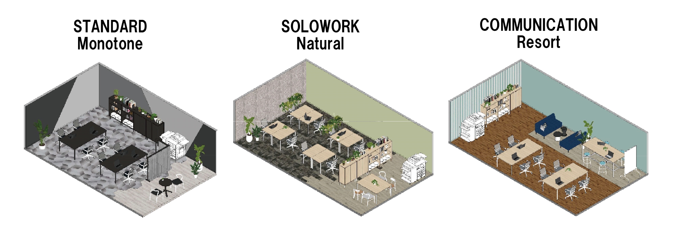 パッケージのメインメニューとして、“働き方レイアウト3種×デザインテイスト6種”の全18種類をご用意しております。各パッケージには内装(床材+壁材)+家具が含まれます。