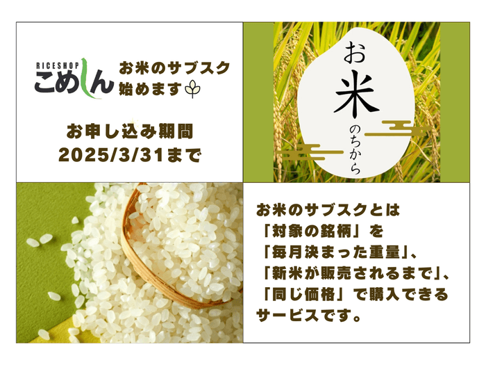 株式会社こめしん(本社:北海道釧路市、代表取締役:徳山 大介)は、店舗来店型『お米のサブスク』サービスの提供を2025年3月1日より開始しました。今年の新米時期までの期間限定で提供いたします。申込受付は3月31日までの予定です。