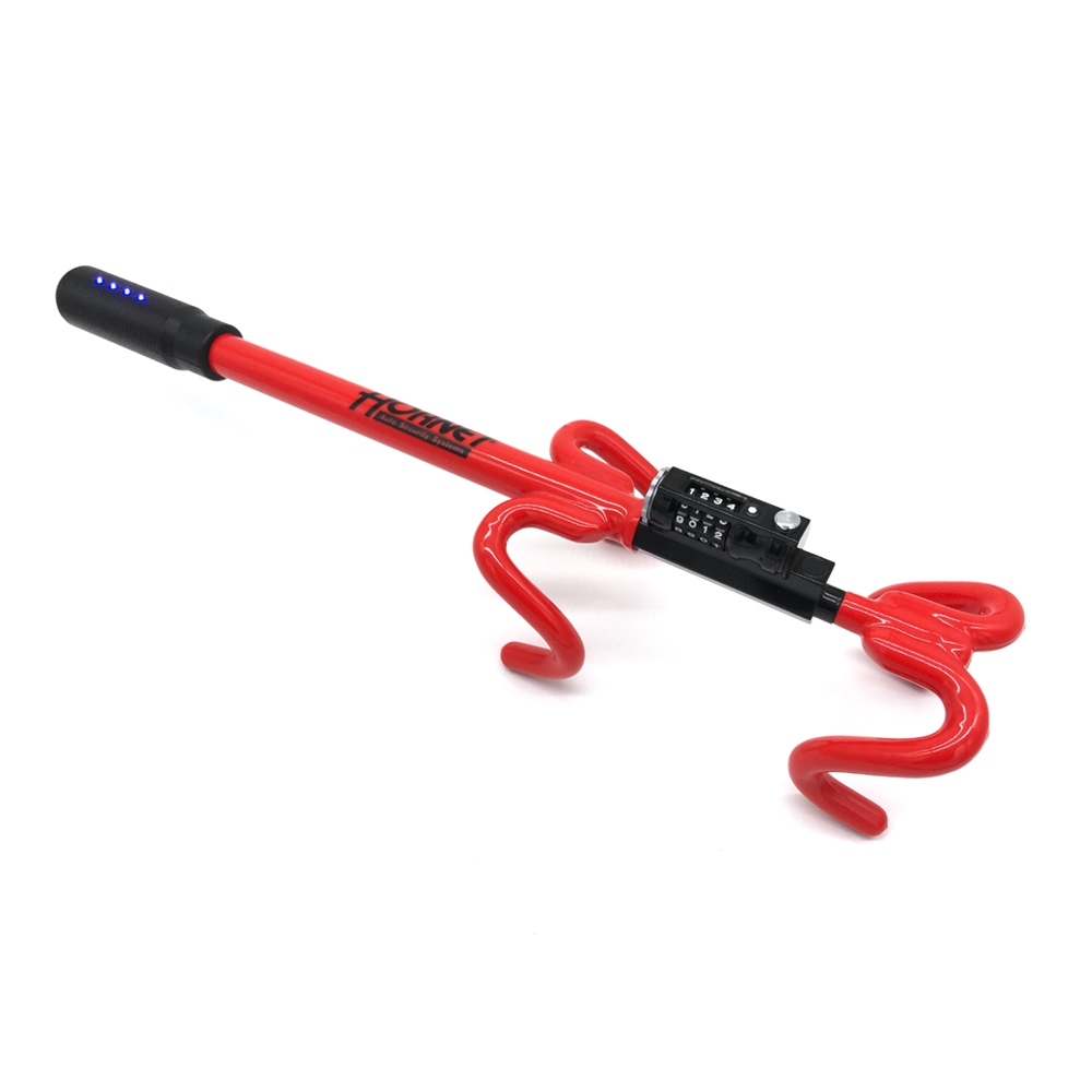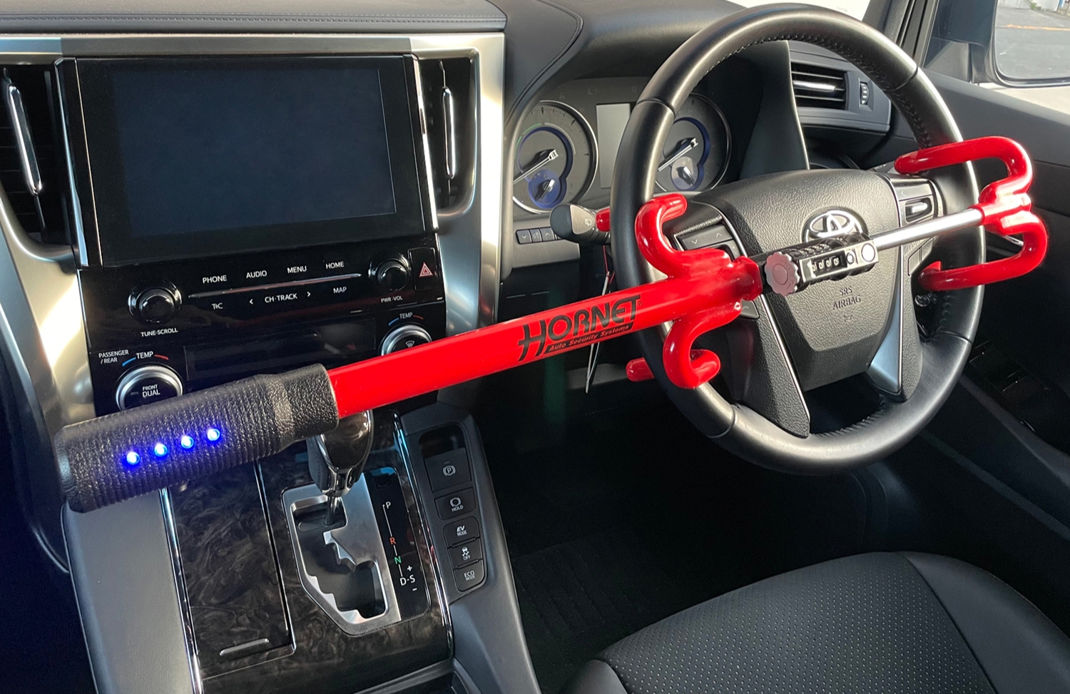 物理的な盗難防止装置としてハンドルロックやタイヤロックを装着することで、車両の盗難防止効果を高められます。そして、自動車盗難が特に夜間に多く発生していることから、視覚的な防犯効果も期待できる4連青色LEDスキャナーをロックバー部分に搭載した、ハンドルロックを発売いたします。本製品はロックアーム部の装着幅1センチ単位で21段階の調整が可能でSUV、ミニバン、トラックなどの幅広い車種に対応しています。また、専用キーを持たずに施解錠ができるので、商用車など複数車両の防犯管理にも最適です。