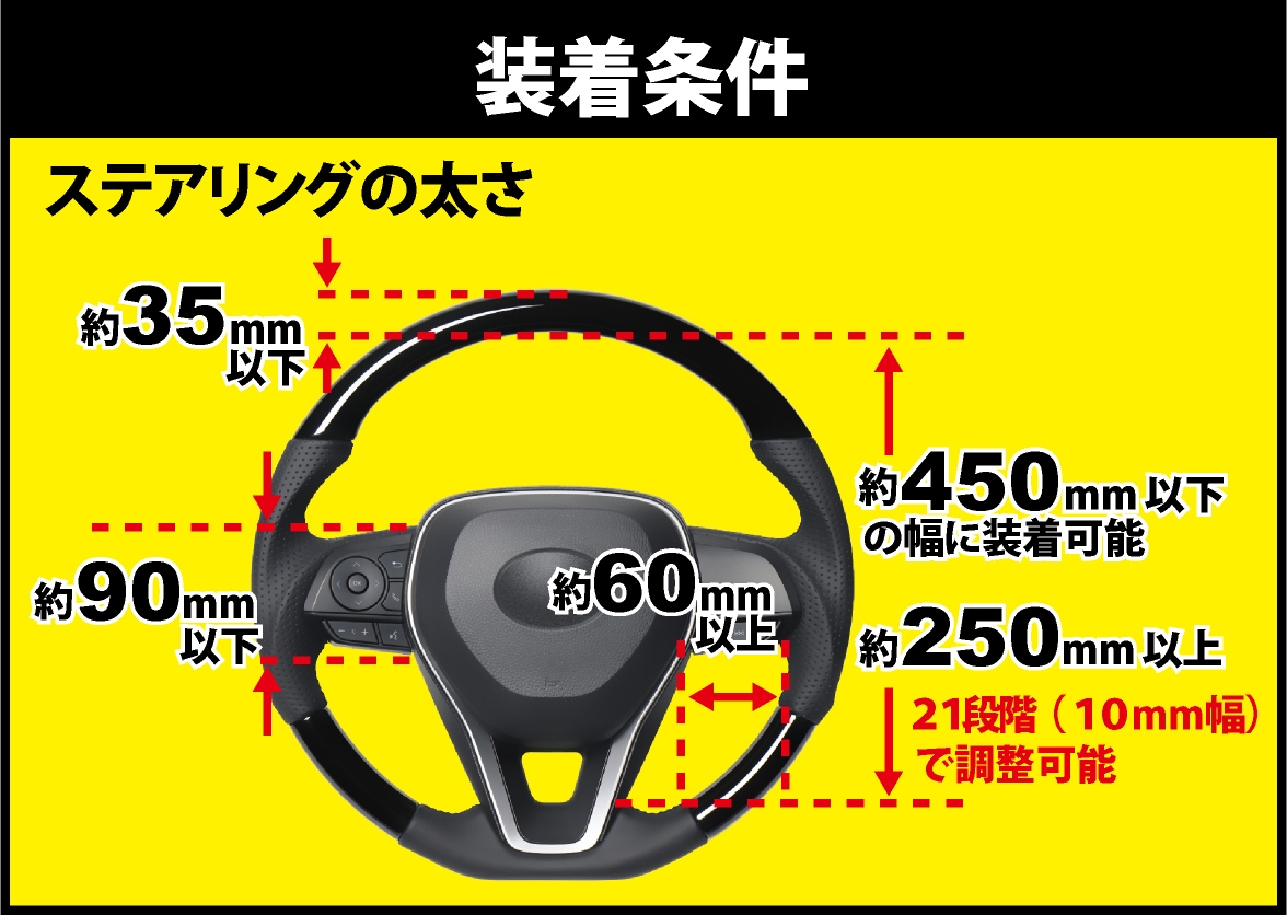 両側に2つずつあるロックアームで車のハンドルのスポークを挟み込むように装着することでハンドルが万一切断されても外れにくい仕様です。装着幅は21段階(1cm幅)で調整可能。切断されにくい特殊合金を採用。