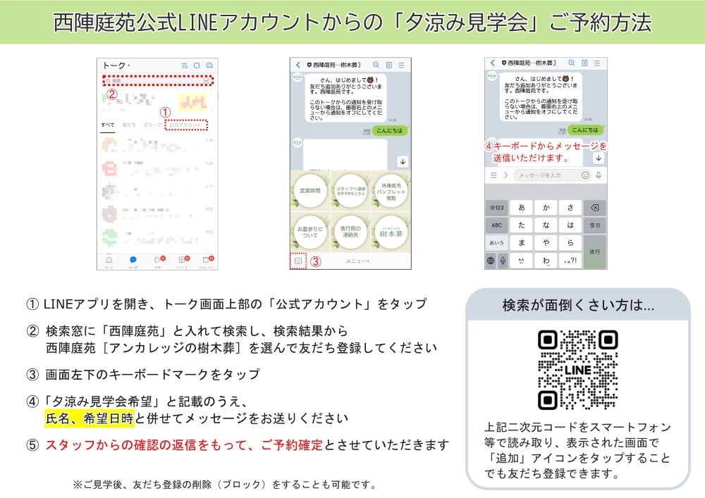 必ず前日16:30までに、西陣庭苑の直通電話、メールまたは公式LINEアカウントにて、お名前とご希望日時をご連絡ください。