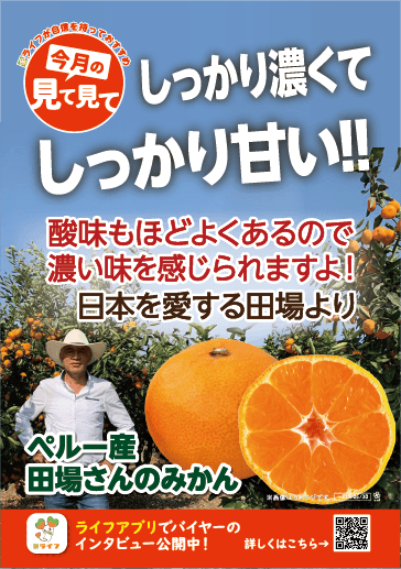 ライフが自信を持っておすすめする「今月の見て見て」の6月商品に選ばれた「田場さんのみかん」は、2020年夏の発売以来大変ご好評をいただいております。みかんと言えば冬が旬ですが、「田場さんのみかん」は日本と季節が真逆の南半球に位置するペルーで育てられているため、夏でも旬のおいしさを味わうことができます。