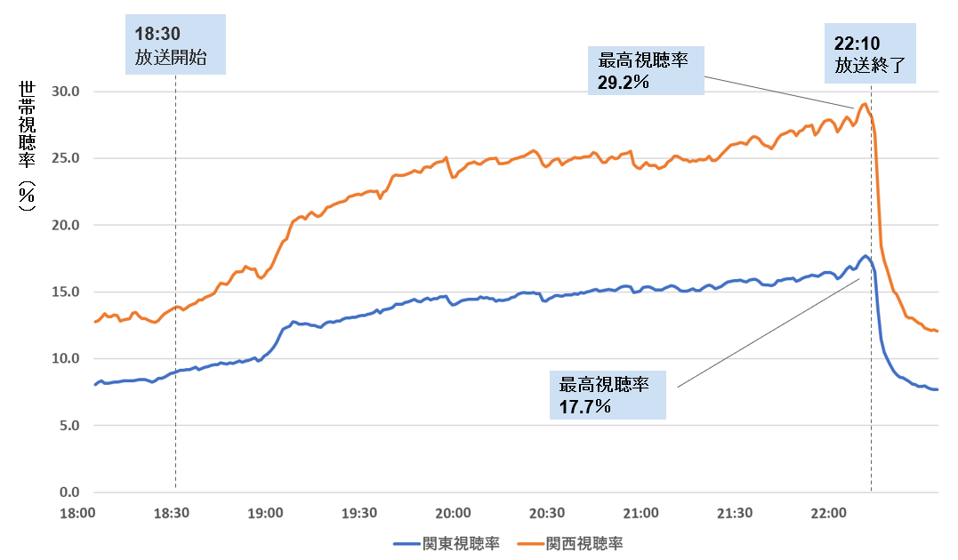 最高視聴率は番組終了間際の22:06で、関東では17.7%、関西では29.2%を記録しました。この時間は優勝者が発表されるため、多くの人が視聴したと考えられます。