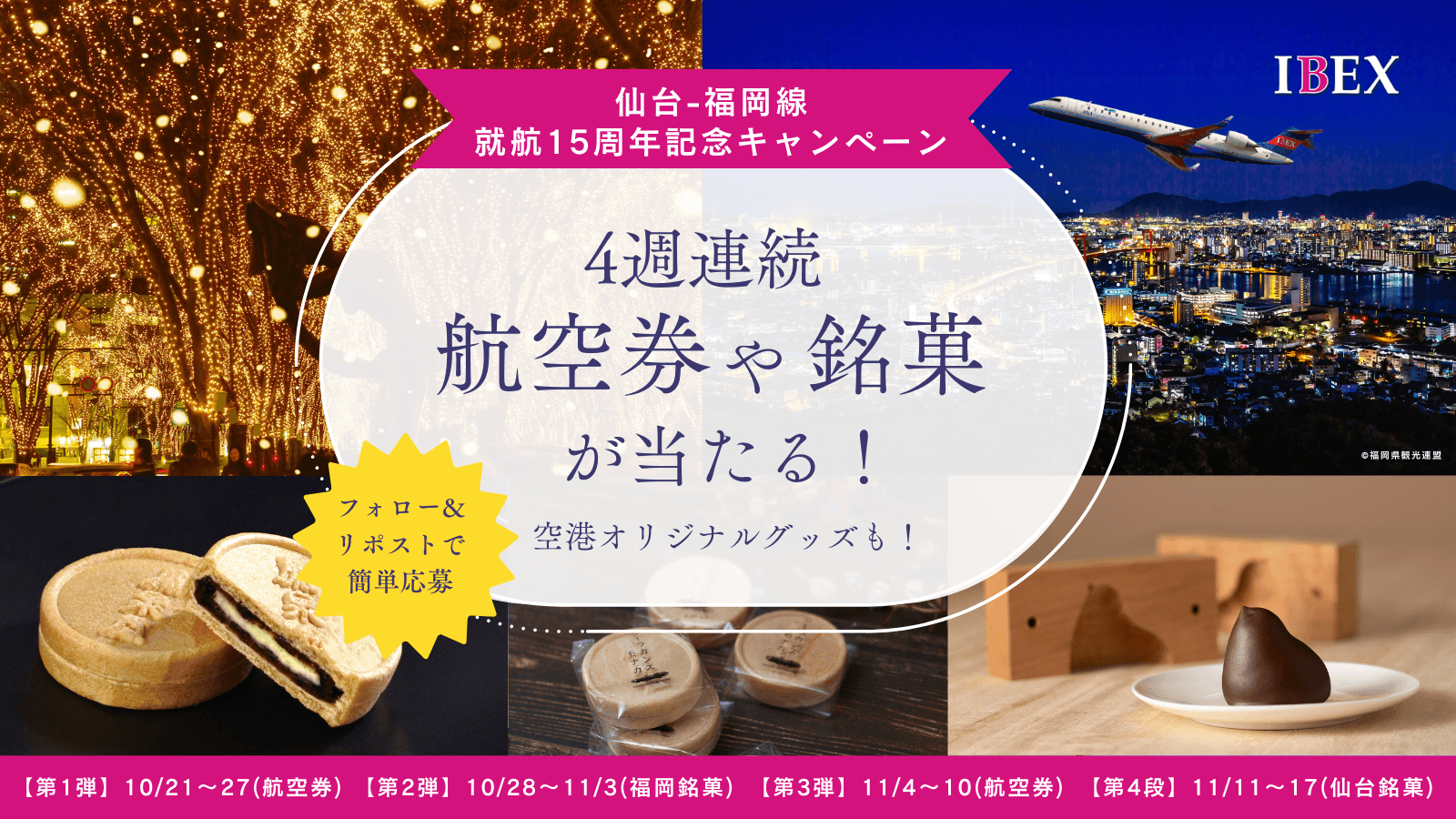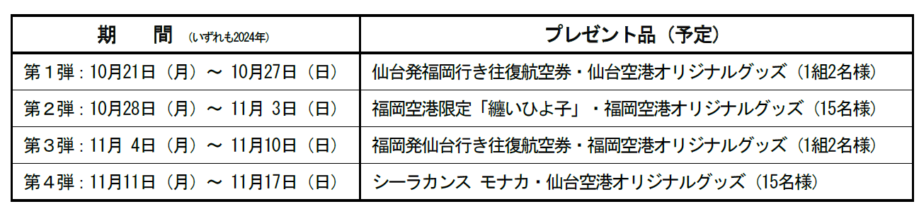 2024年10月21日(月)から11月17日(日)の間、IBEX公式X(IBEX_promotion) にて、ペア往復航空券や搭乗記念品としてもお配りする「シーラカンス モナカ」、福岡空港SNS事務局セレクト福岡空港限定「纏いひよ子」、仙台空港・福岡空港のオリジナルグッズなどの当たるキャンペーンを実施いたします。