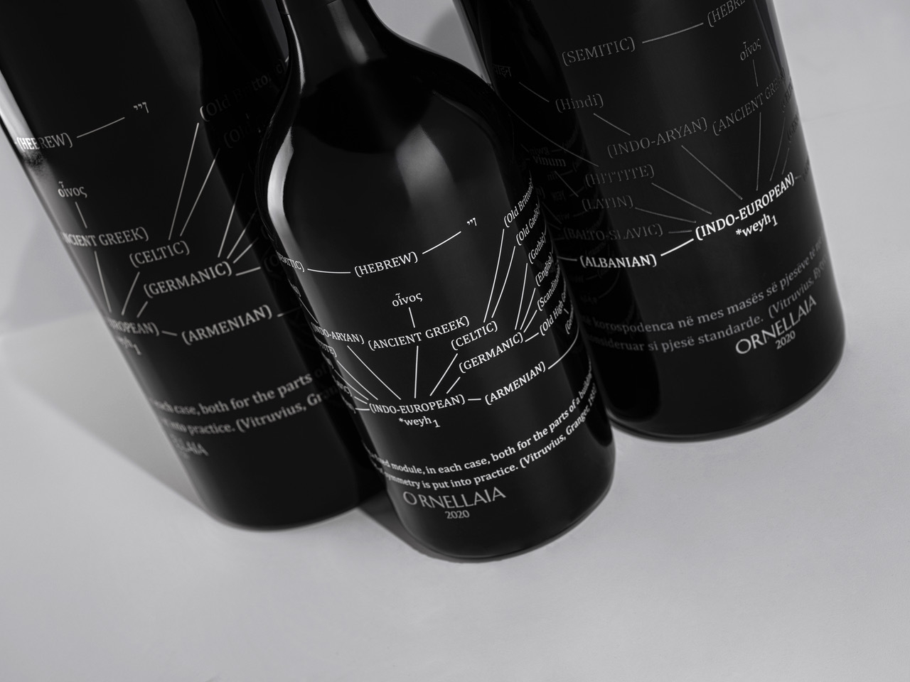 ヴェンデミア・ダルティスタとは、芸術とワインの融合であり、オルネッライアの最新ヴィンテージを芸術作品で表現するプロジェクトで今年で15回目を数えます。2006年のヴィンテージから、著名な現代アーティストとのコラボレーションによりアート作品とアートラベルをデザインしています。毎年、限定ボトルはサザビーズの慈善オークションで合計111本を販売し、収益金はソロモン・R・グッゲンハイム美術館が立ち上げた「マインズ・アイ」プロジェクトに全額を寄贈しています。最新ヴィンテージの「オルネッライア2020」は、アメリカのコンセプチュアル・アーティストであり、思想家としても名高い現代美術家「ジョセフ・コスース」が起用され、ワインという言葉の語源を表す系図を表現し、新しいヴィンテージの誕生を祝います。