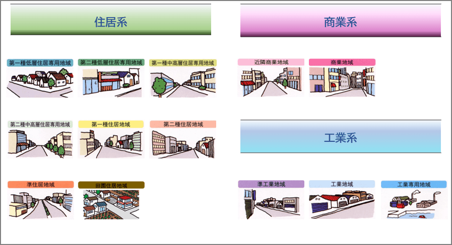 このルールこそが「用途地域」であり、都市計画法に基づいてエリア分け(ゾーニング)されています。