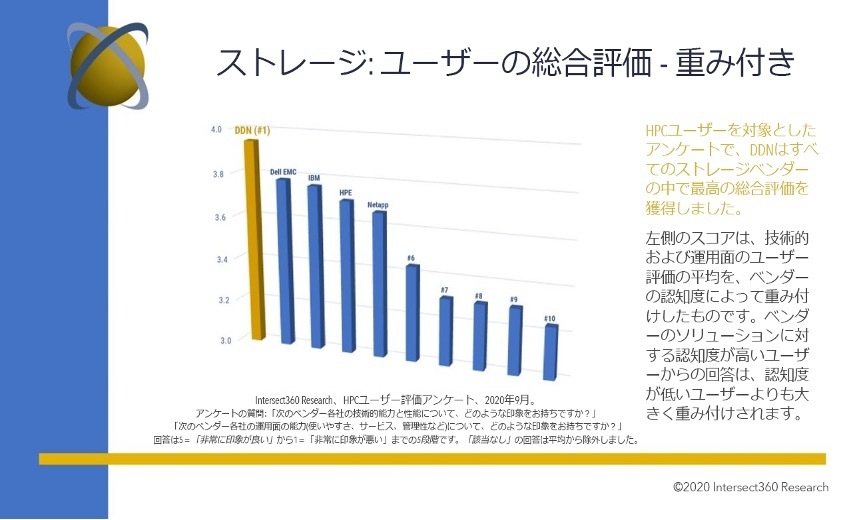「DDNは高い技術力と幅広いグローバル規模の顧客層を保持しており、顧客ロイヤルティの面でも将来の採用見込みの面でも優れた評価を得ています。」Intersect360 ResearchのCEOを務めるAddison Snell(アディソン・スネル)氏は語ります。「ユーザーがDDNのソリューションをどの程度認知しているかという点を考慮してスコアを重み付けしてみると、印象度はさらに上がる傾向にあります。DDNは「技術力があるベンダーという印象」の項目で大きくリードしています。組織の将来のストレージのニーズを検討した、あらゆる重み付け方式で最高点となっており、故に今後の導入の可能性が最も高いベンダーと評価されています。」