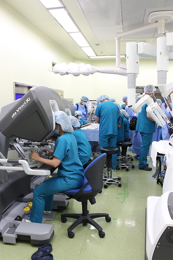 当院は、埼玉県県央医療圏(上尾市・桶川市・北本市・伊奈町・鴻巣市)の中核病院として、地域の皆さまに安全・安心な医療を提供しております。中でも、内視鏡手術支援ロボットを用いた低侵襲手術(身体への負担が少ない手術)は、当院が注力する分野のひとつです。現在、米国製「ダビンチ」3台に加え、国産の手術支援ロボット「hinotori(TM)(ヒノトリ)」も導入し、外科・消化器外科・呼吸器外科、泌尿器科、耳鼻いんこう科・頭頸部外科、産婦人科などの診療科において、ロボット支援手術を幅広く実施しています。