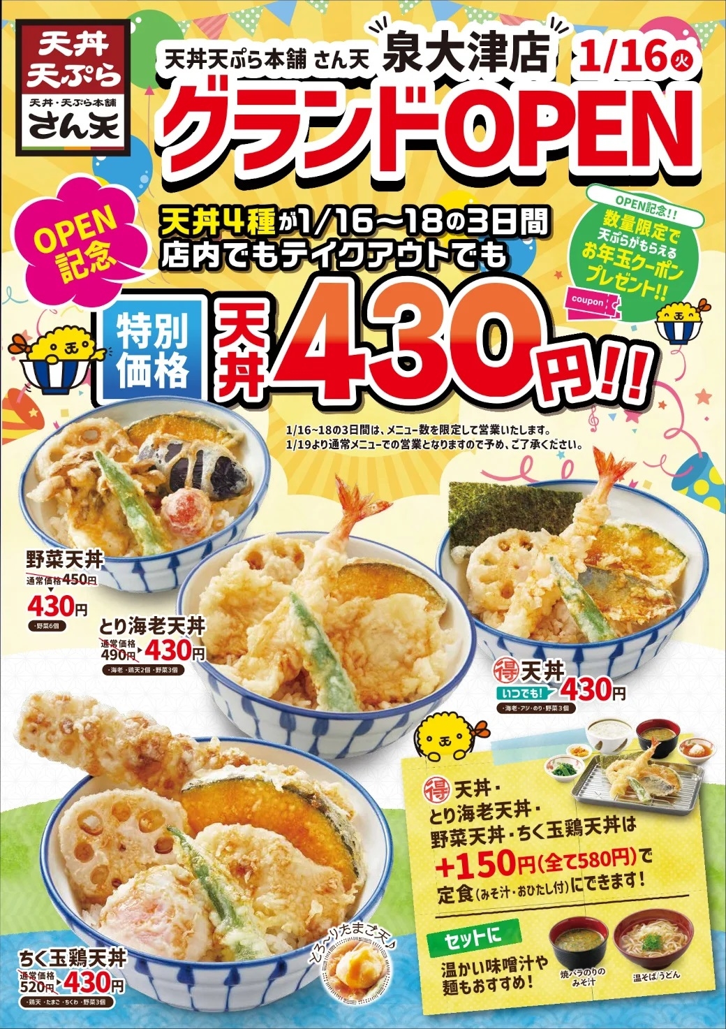 オープン記念として、1月16日(火)~1月18日(木)まで天丼430円祭りを実施します。