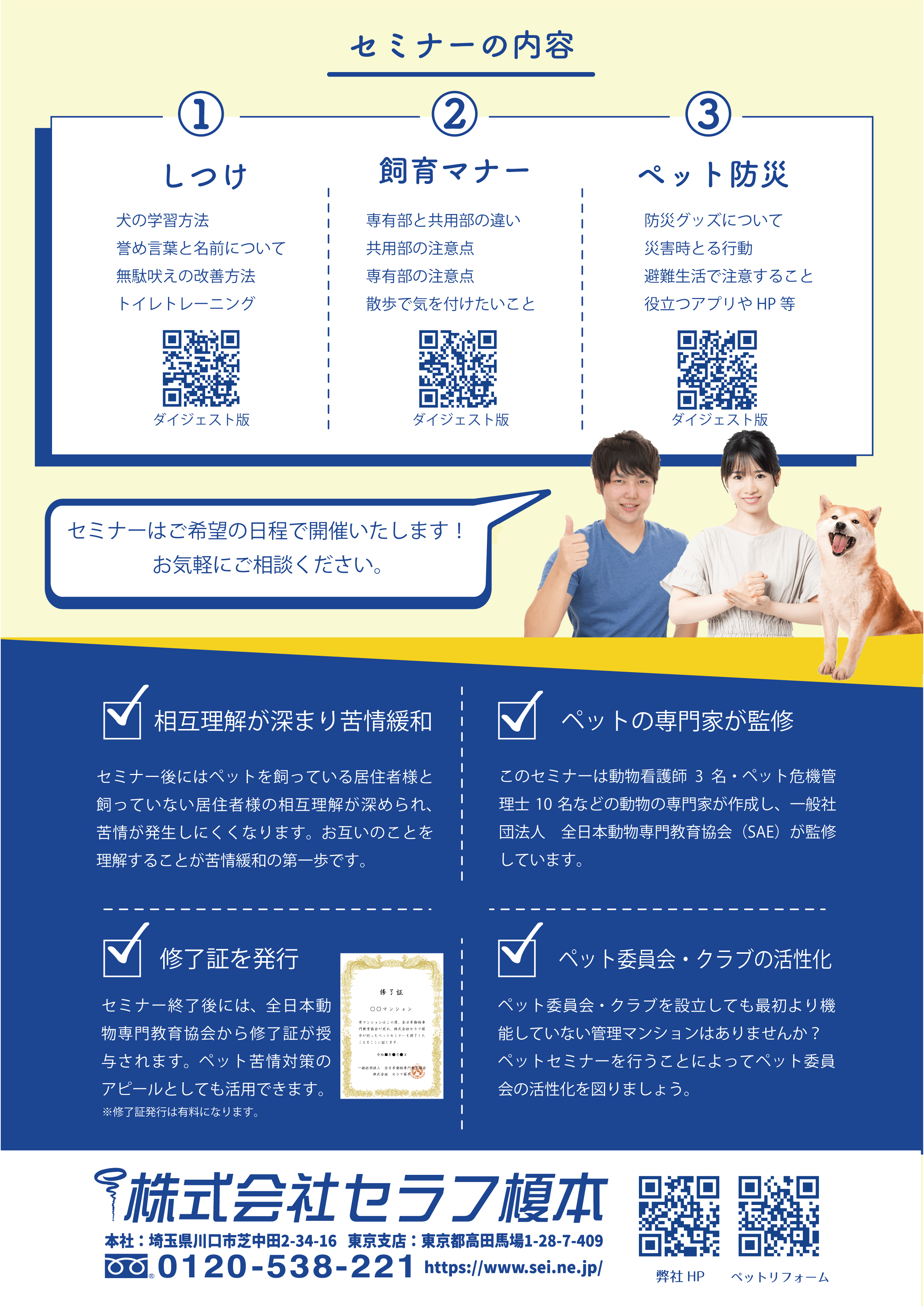 セラフ榎本では実際にマンションまで出張し対面式でセミナーを行う、「ペット問題解決セミナー」も行っております。この出張セミナーは、今回配信するセミナーよりも内容がより詳しくなっており、一般社団法人 全日本動物専門教育協会(SAE)が監修済みです。さらに事前に問題点などをお伝えいただくと、各マンションに合わせたセミナー内容に修正も可能です。また、セミナーは日本語表記だけでなく、中国語表記の対応も行っております。