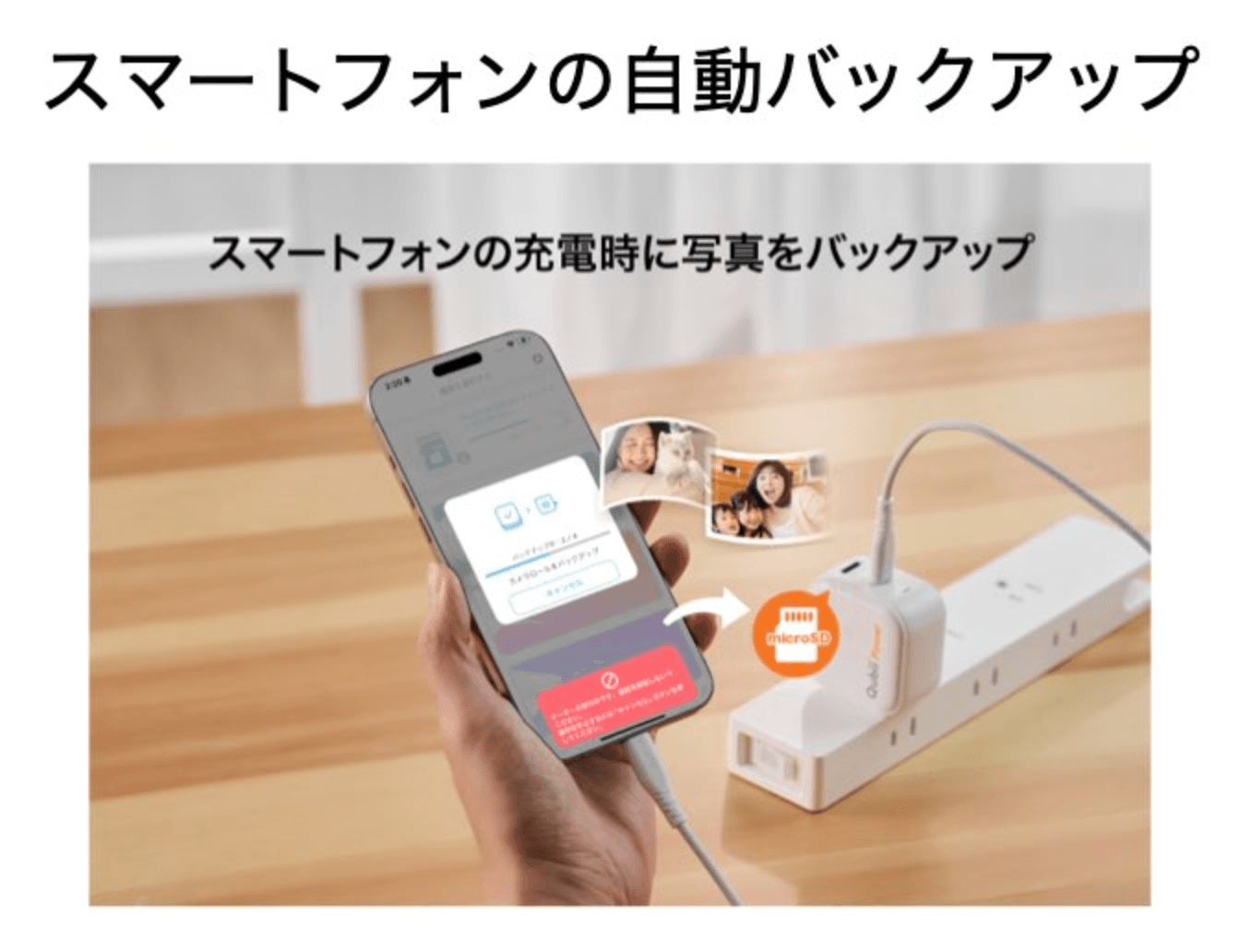全世界での累計販売台数が100万台を超えた「Qubiiシリーズ」はスマホを充電しながらデータを自動バックアップできる画期的な製品。充電する時と同じように接続するだけで、データはmicroSDカードに自動的に保存される仕組みです。