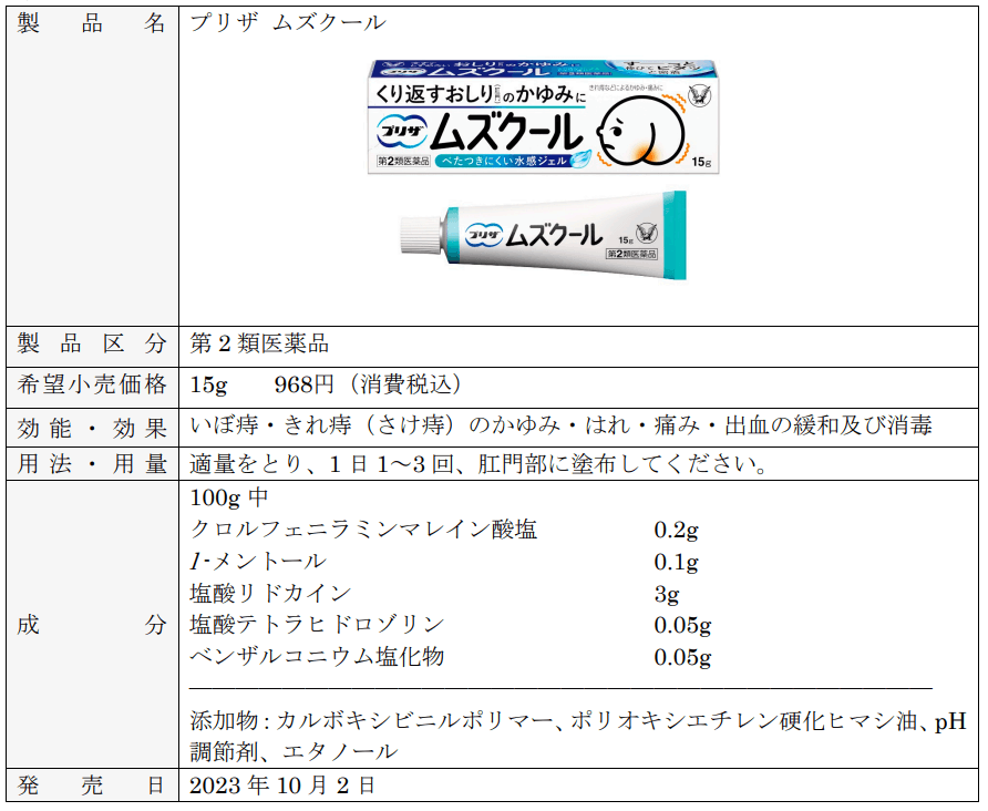 大正製薬株式会社[本社:東京都豊島区 社長:上原 茂](以下、当社)は、きれ痔などによるかゆみ・痛みに効果のある塗り薬「プリザ ムズクール」(第2類医薬品)を10月2日(月)に新発売いたします。