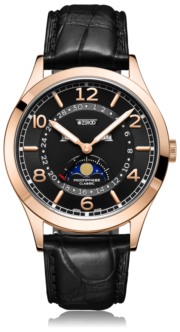 古典とモダンの融合した腕時計デザインを得意とするZEROOから正統派のドレスウォッチが誕生しました。高級時計の代名詞的機能であるムーンフェイズ、日、曜日、月のトリプルカレンダー機能が搭載された、信頼のMiyotaムーブメントを採用。日本人として一番しっくりくるケースサイズ38mmを採用。ストラップにはアリゲータ・ラージスクエアのハンドステッチを施しています。内部にペルラージュ加工が施されたDバックル、細部にもこだわり抜きました。