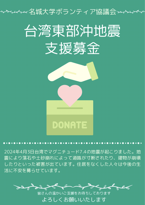 【名城大学】ボランティア協議会が台湾東部沖地震の支援募金を呼び掛け
