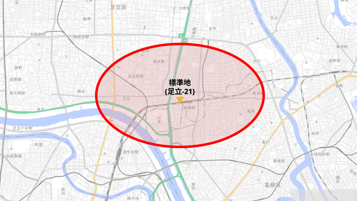 今回は、標準地(足立-21)周辺の下記エリア内のマンション事例①(築10年~19年)、マンション事例②(築20年~29年)、マンション事例③(築30年~45年)を対象に、過去5年の一般市場価格を抽出します。