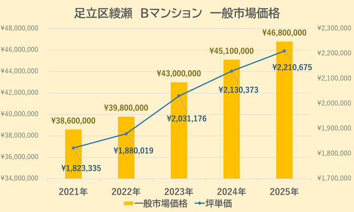 Bマンションの一般市場価格・坪単価の推移は上記【図4】の通りです。