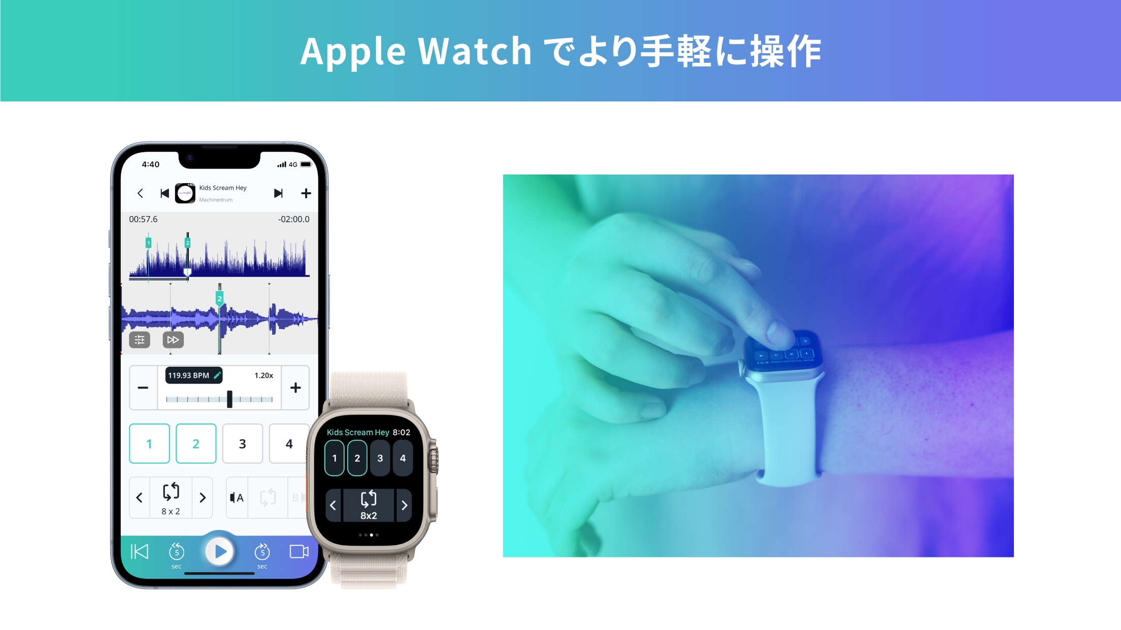 iPhoneをどこかに置いて離れたところから操作したい場合は、Apple Watchの「DanceTribe Remote」アプリでMarker/Loop/撮影などの操作ができます。