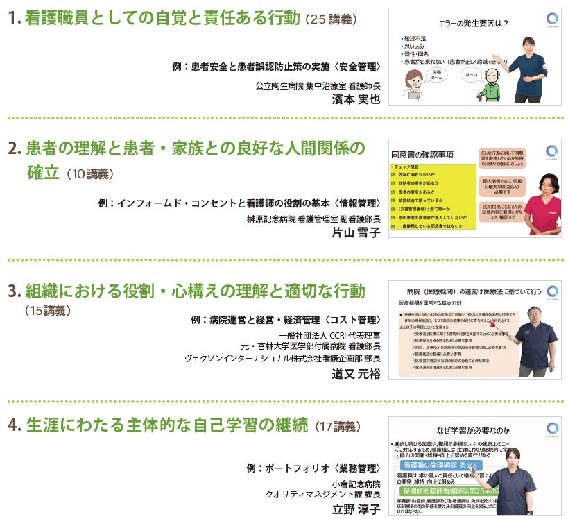厚生労働省新人看護職員研修ガイドラインでは、「基礎姿勢と態度」「技術的側面」「管理的側面」の3側面での学習を推奨しており、S-QUE新人看護職員研修は、技術だけではなく、新人看護職員が「基本姿勢と態度」「管理的側面」も学習できるように完全設計しております。