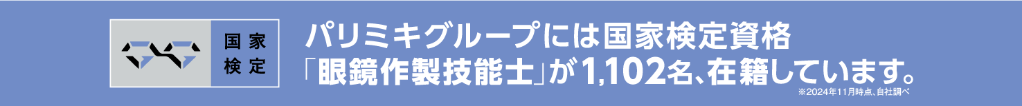 ■国家検定資格「眼鏡作製技能士」全国で1,102名の合格者が在籍2022年4月より、国の定める「技能検定」の職種に「眼鏡作製職種」が新設され、国家検定資格「眼鏡作製技能士」がスタートし、パリミキグループでは現在1,102名の合格者が在籍しています。(※2024年11月時点、自社調べ)多様化・高度化するお客様のニーズにあわせて、「適切な診断・治療」と「適切な眼鏡作製」の双方の実現に向け、眼鏡技術者が眼科専門医と連携しつつ、皆様により良い眼鏡を提供し、目の健康を守れるよう、眼鏡作製技能を高めてまいります。